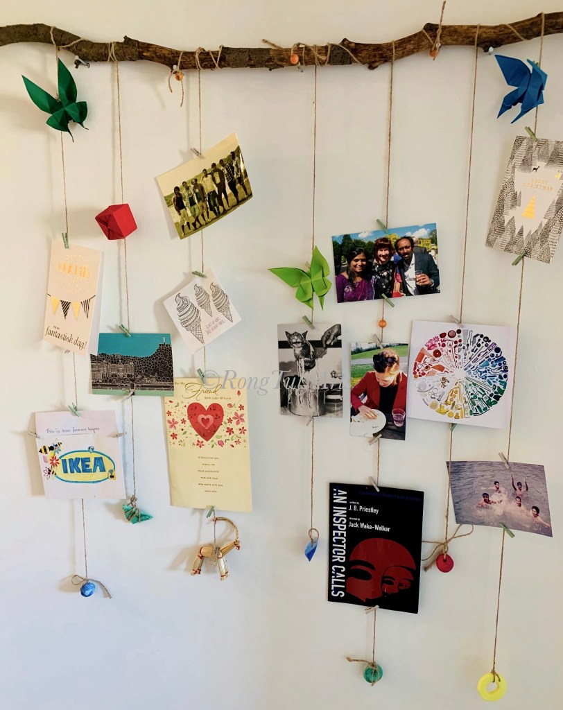 Seeing it, I wanted to make one for me. My idea was to find the main wooden stick from nature. Things I had to buy are strings and the small clips, that holds the photos and the cards with strings. Then one fine lazy evening, gathered all my cards and photos and made this cute photo hanger. Well I really don’t like to call it a hanger. May be you have a better name for it?