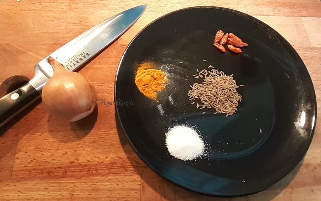 The ingredients are few: cauliflower, potato, pinch of salt, onion, turmeric, dried chili, any of your favorite vegetable oil and pinch of whole cumin.