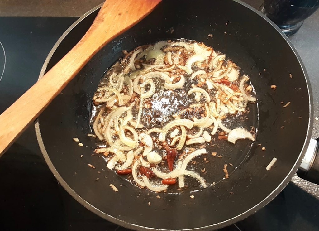So the first step to cook a Bhaji is to put seasoning in warm oil. Please also take note to warm the oil just enough, not to heat it til burning point. Put the seasoning, in this case whole cumin in oil and if you are brave, put dried chili in the oil too.When cumin starts bubbling, put sliced onions on the pan.