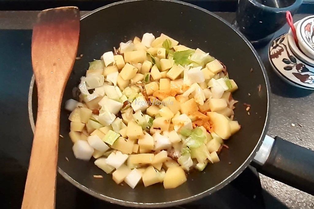 Saute onions until golden brown and then put your cubed potatoes and cauliflower stems. At this step add turmeric powder and salt too. You need to give everything a very good stir for at least 5 minutes in a medium heat. Stirring potatoes and turmeric together will create a very nice aroma and color.