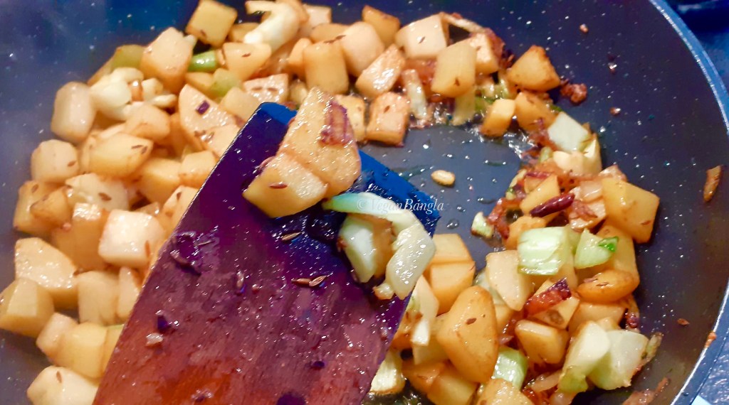After a while you will see that potatoes are changing colors, it starts to get reddish around the edges. Now, at this point, I turn the heat lower and cover the pan, so the potatoes can get cooked in its own water. Usually we don’t add waters in Bhaji dishes, however if you feel your veggies need to get cooked properly, you can add water, but just in a very little amount!