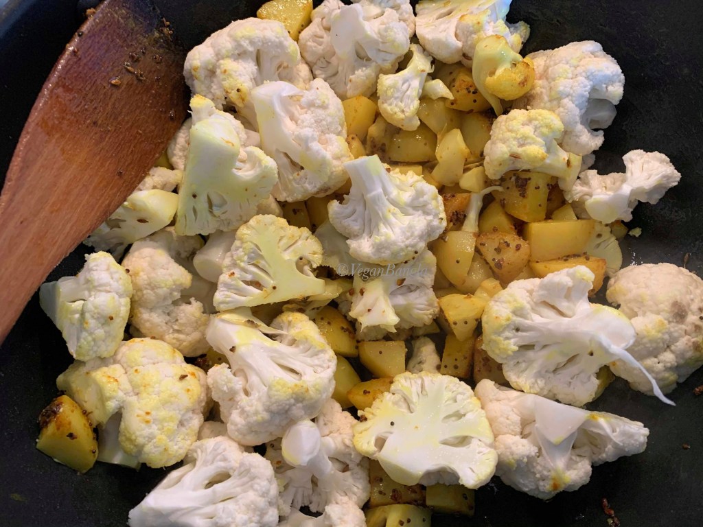 So, to start I peeled and cut the potato in 2cm cube, same goes for the stem of cauliflowers. I cut the caulis in big florets, as I like them in big chunks. But you can cut them small if you prefer!