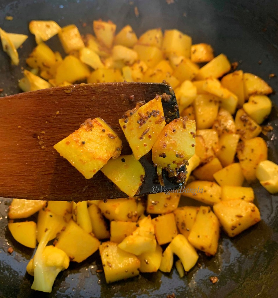 | Instruction 1. Cut potato into 2cm cubes (you can keep potato skin on if you like) and cauliflowers in big floret. 2. Heat oil in a wok or big pot, put Pach Phoron and let them start bubbling a bit. 3. Add potato, salt and turmeric powder in the pot and give them a very good stir until they are roasted well and changes color. 4. Then add cauliflower florets and stir them until they are coated well with the spices and little bit roasted. 5. Now add 100 ml water, cover pot with lid and boil the veggies until they are translucent. 6. Now add beans, let the veggies simmer a bit til your desired stew consistency. 6. Garnish your curry with coriander leaves or ground cumin powder as per desire. and Enjoy with rice or bread! |