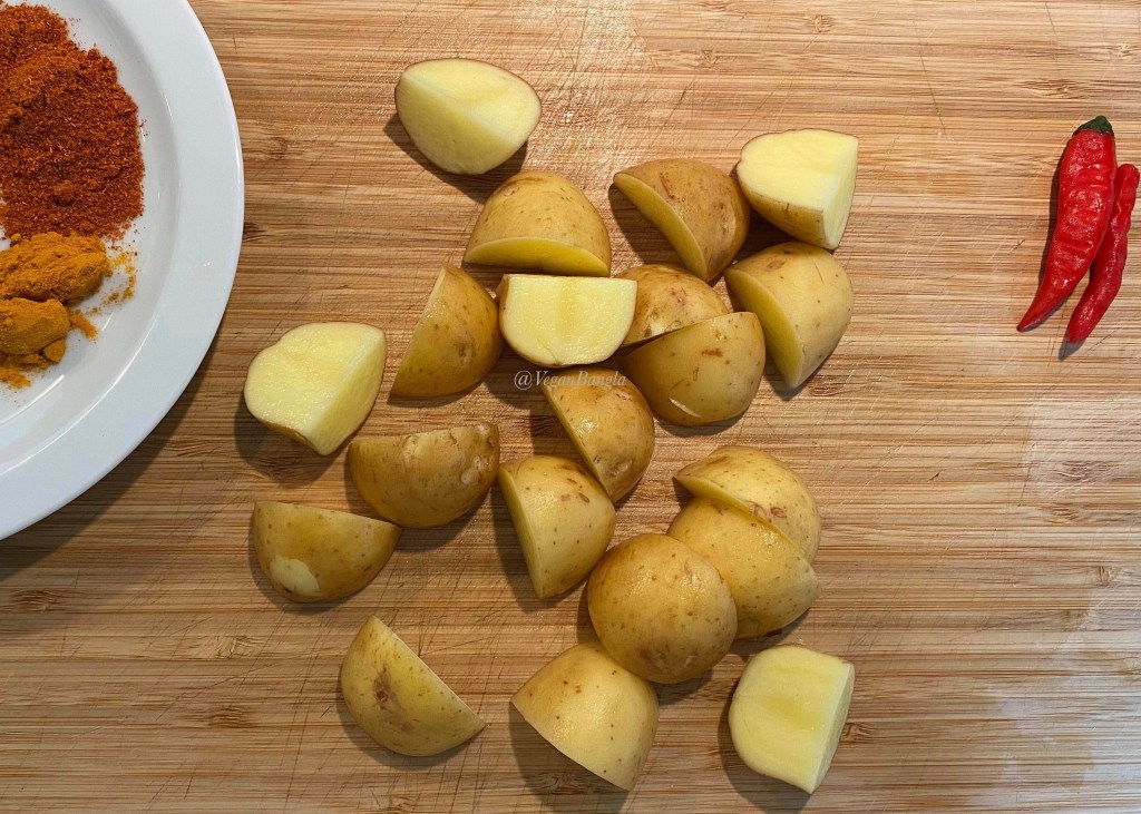 Basically, you just need potato, aubergine and some usual spices like ginger paste, turmeric, coriander, cumin and chili powder for this curry! I have also used two red chilies in this curry.