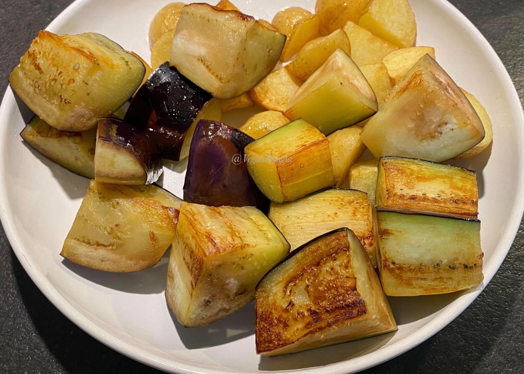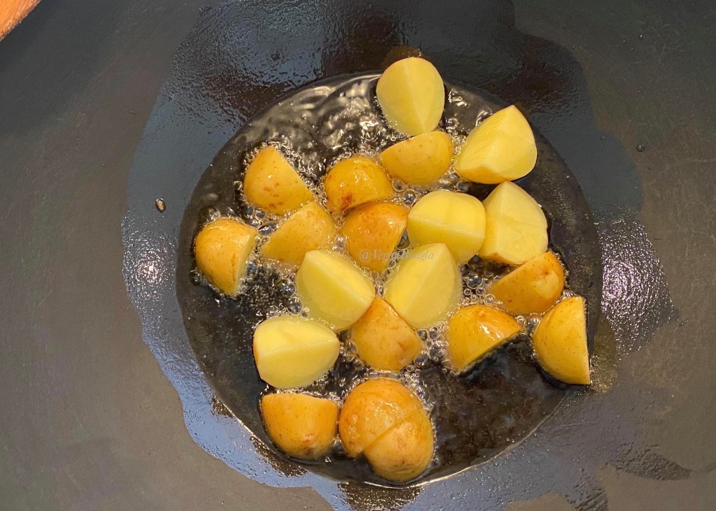 Now, fry the potato and aubergine cubes separately in a skillet. You don’t have to deep fry them, as the veggies just need to roast slightly until they change colors. There is even no need to coat the veggies with turmeric or chili powder, as they will burn and turn black in the hot oil.