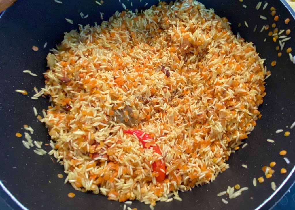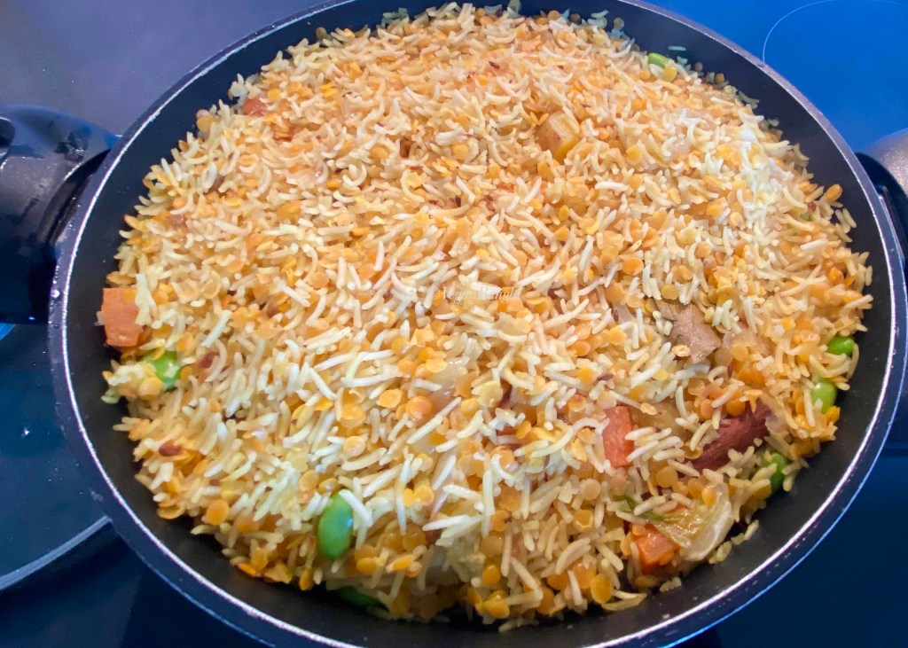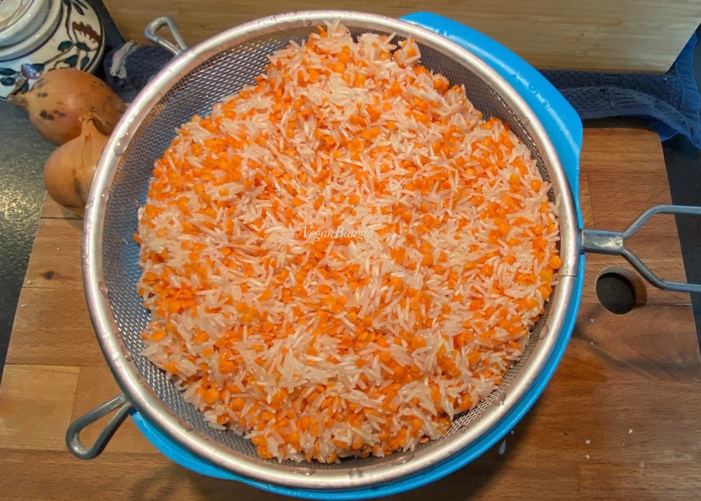 Another important steps is to wash rice and lentils very well with lukewarm water until the water is clear enough is see through the lentils. Use a colander to strain waters as much as possible as it will ensure a perfect stir fry them at next step.
