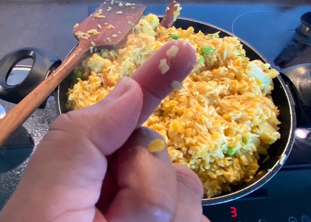 After 10 minutes, open the lid. If you see the top layer looks cooked. However to be sure, taste with a tea spoon or use index fingers to check if the rice has cooked properly.