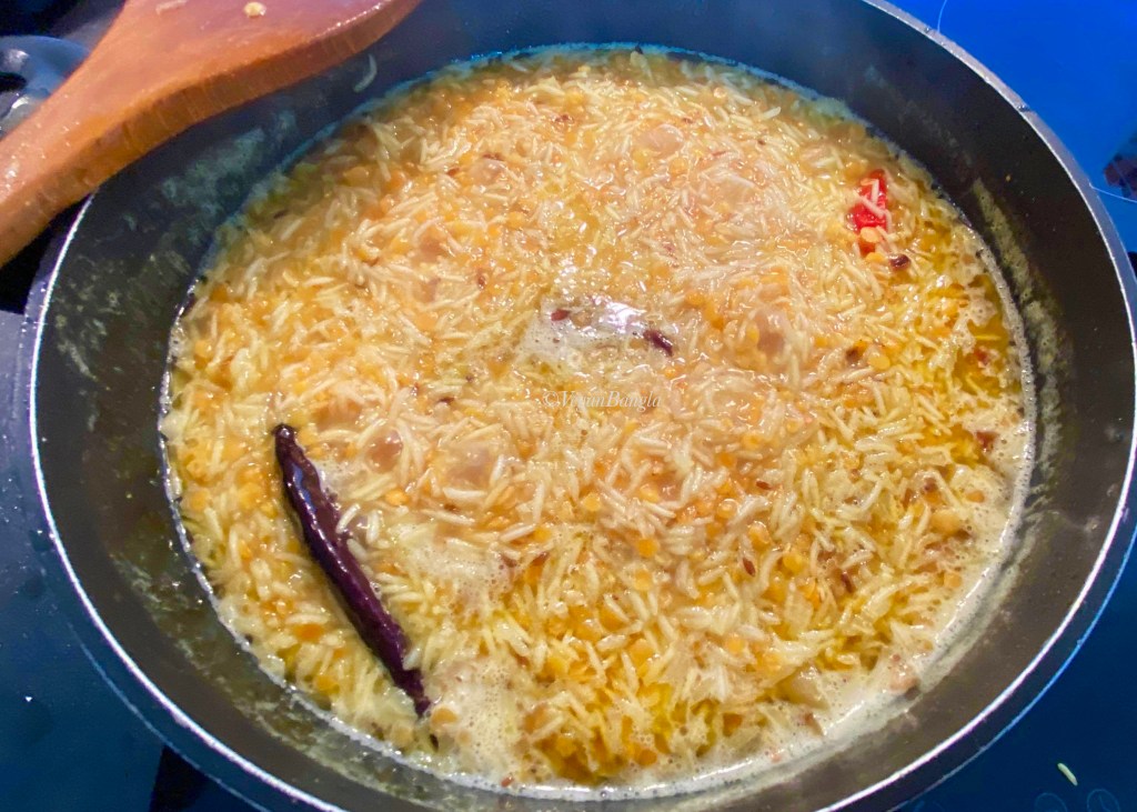 Cover the pot with lid. Must turn the flame in low heat as it is time to simmer and completely cook the rice-lentils.