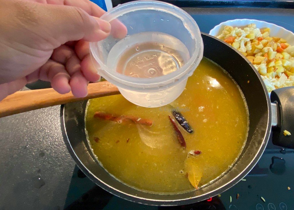 I don’t know how clear you can see it from the picture that the rice got opaque and bit roasted too. This step is a must if you want a super flavored Khichuri, but you can skip the whole stir fry step if you are on hurry. You can directly add water to rice-lentil and veggies after caramelizing onion.