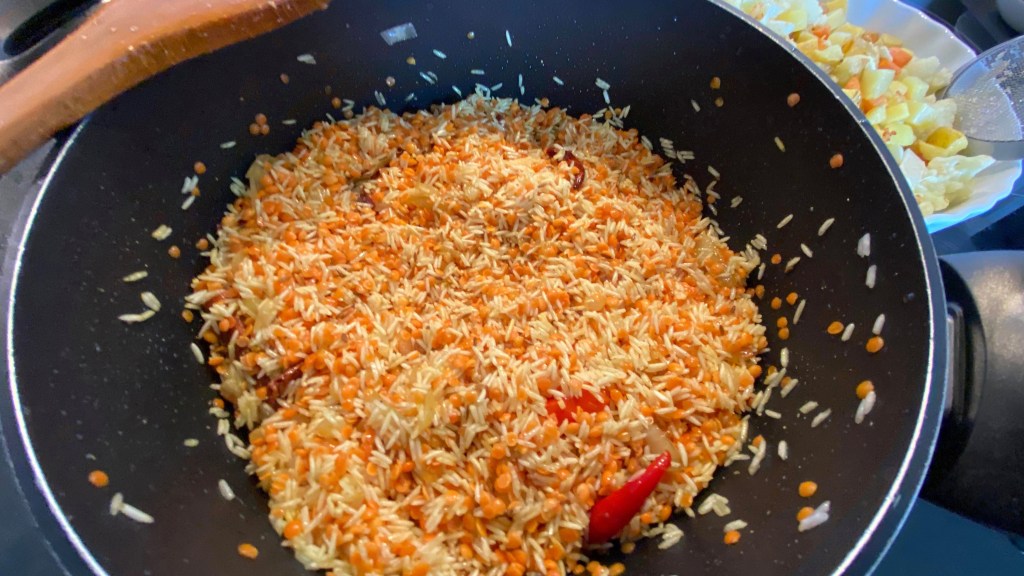 You will see the change in color and consistency of rice-lentils after stir fry them for 10 minutes. The color will get darker and rice will get crispier.