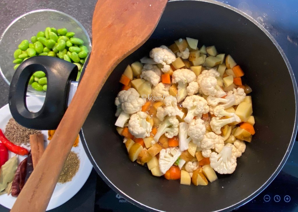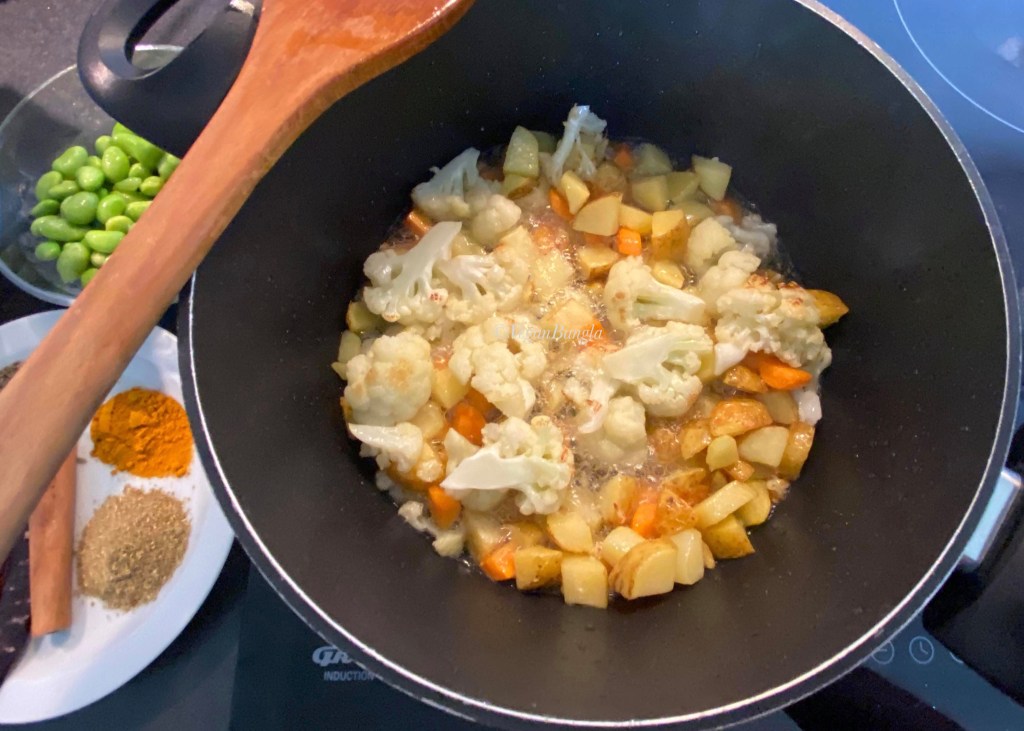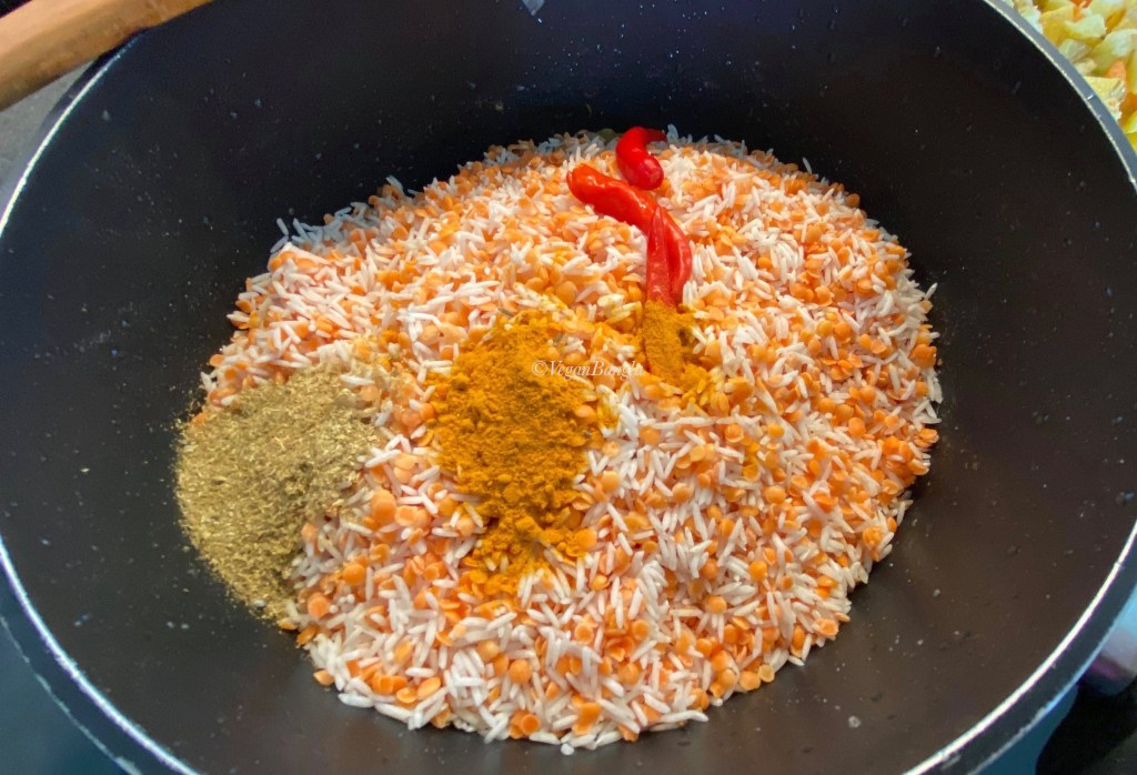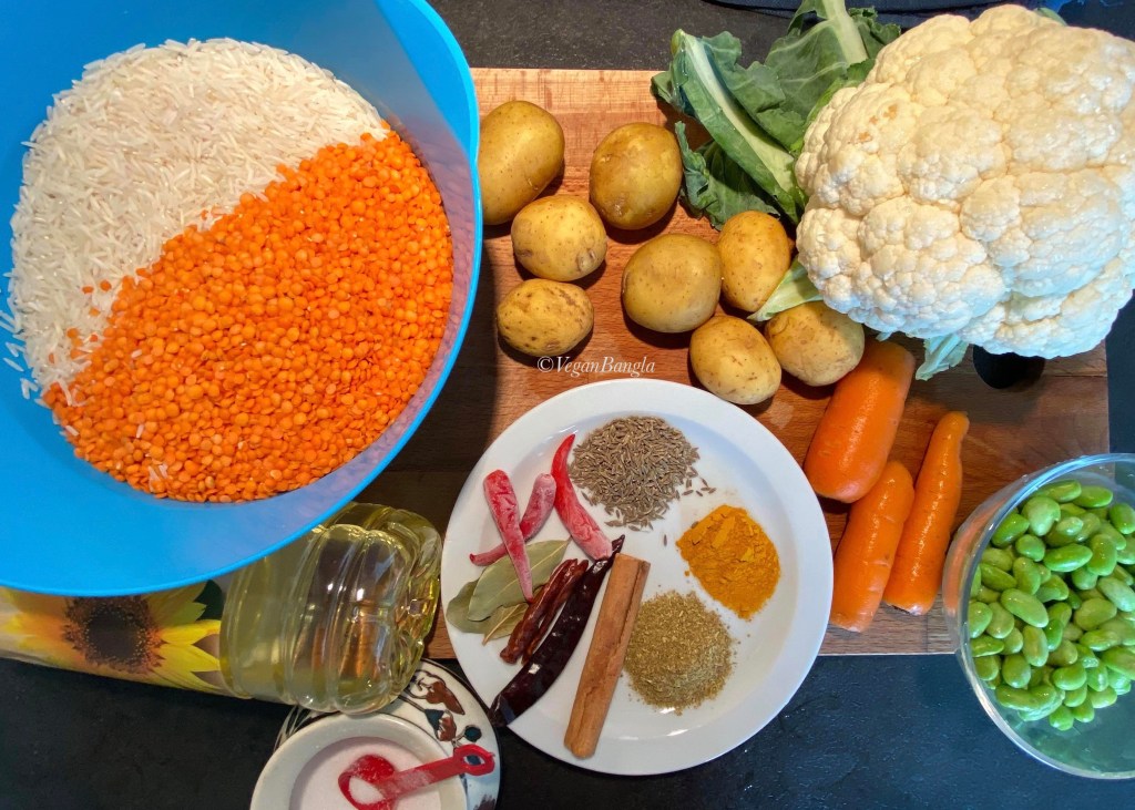 The list of the ingredients can be seems daunting, but they are pretty common to find in the kitchen. One of the best thing about Vegetable Khichuri is that it can be a complete meal, which is prepared under an hour! So if you have a busy day, this can be the easiest-one-pot-vegan-comlete-dish! I will try to explain the recipe as simple as possible. The main ingredients are rice and lentil and among veggies you can choose whatever you like.
