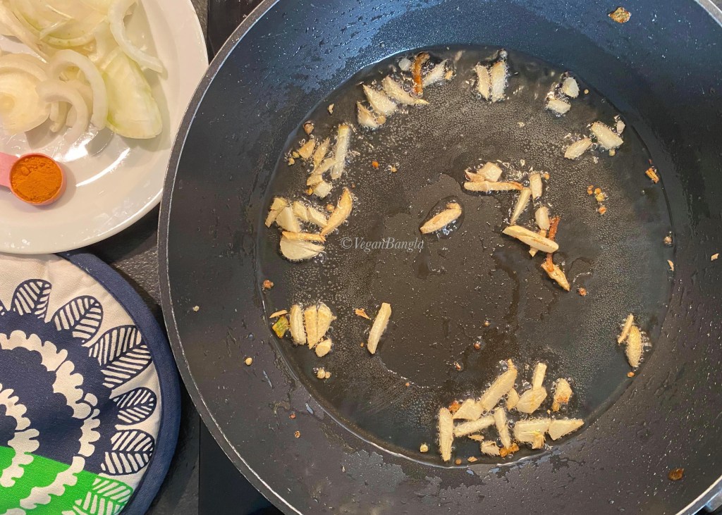 When garlic is ready, add sliced onion and cook them until golden brown. You can add chili in this step too.