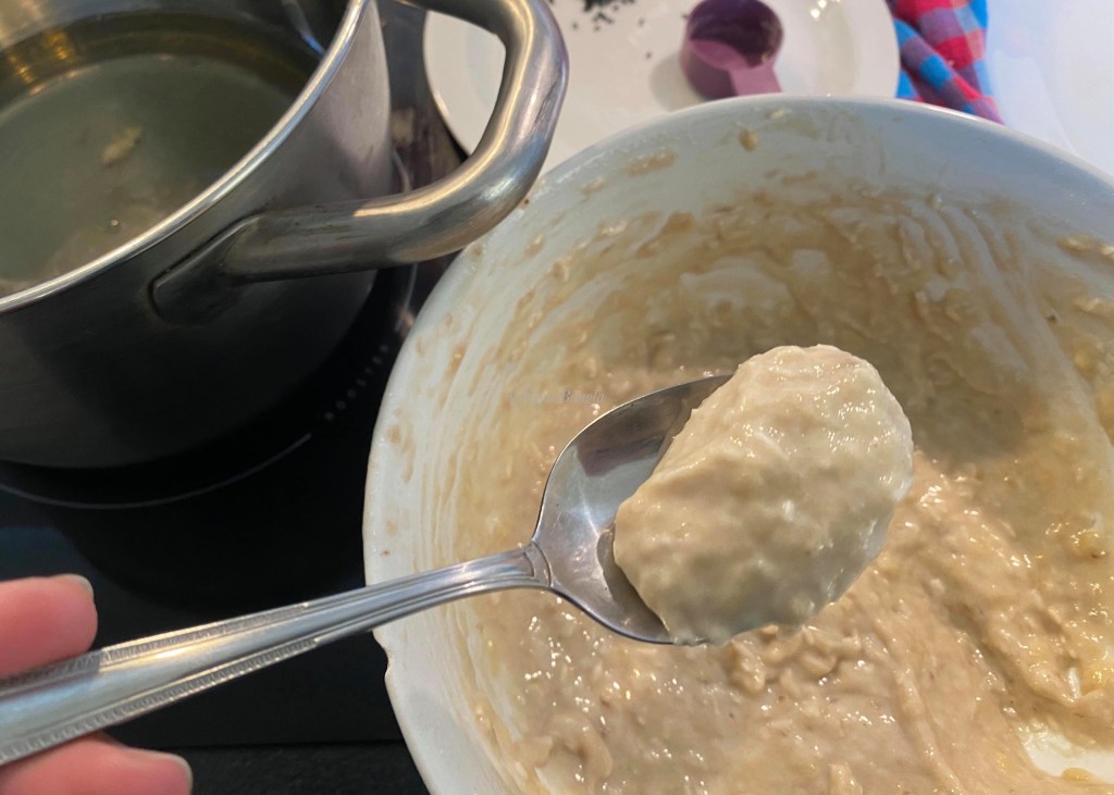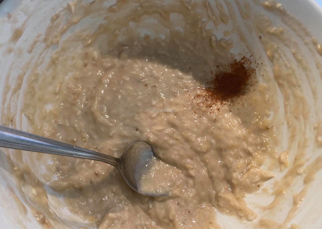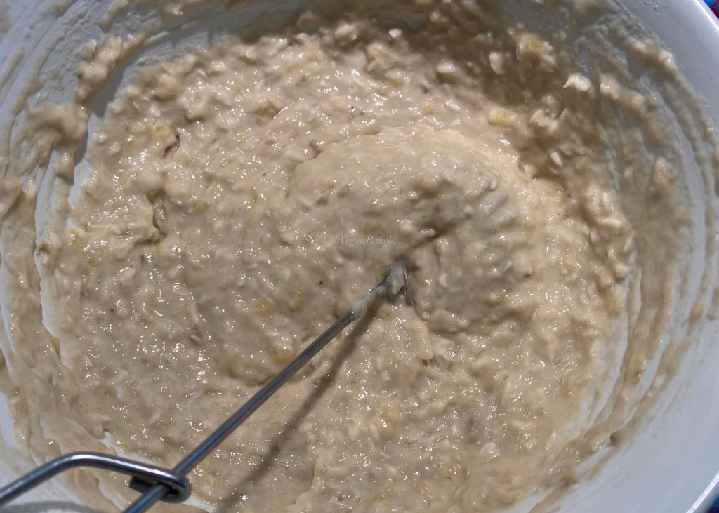 After beating them for a while, I added coconut flakes. This is optional ingredients. I have added 2 teaspoon of coconut flakes so it does not overpower the taste of banana. Now rest the mixture for atleast 10 minutes to maximum 30minutes. If you rest too long, the dough gonna get smelly, and you don’t want that.