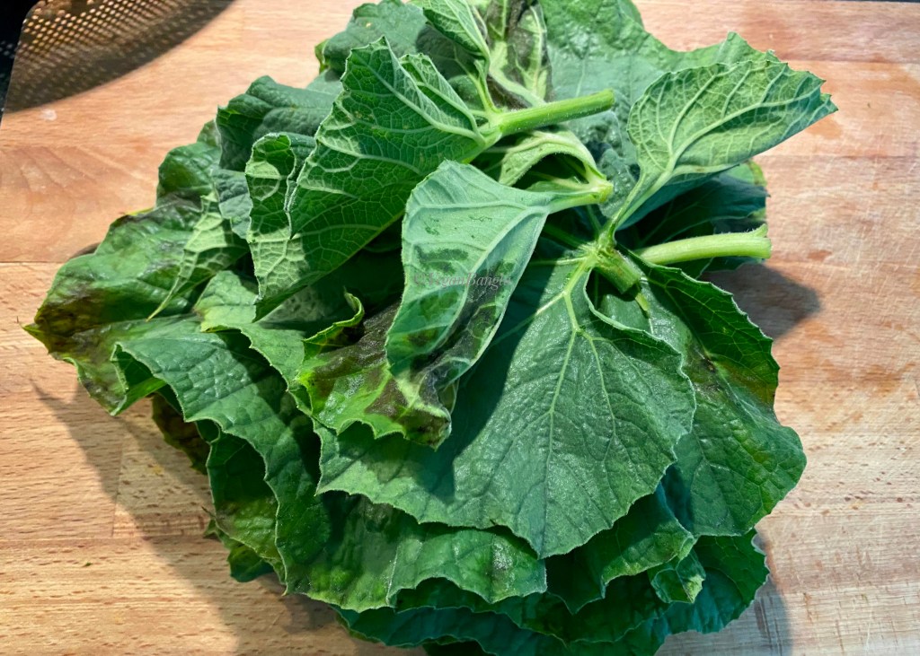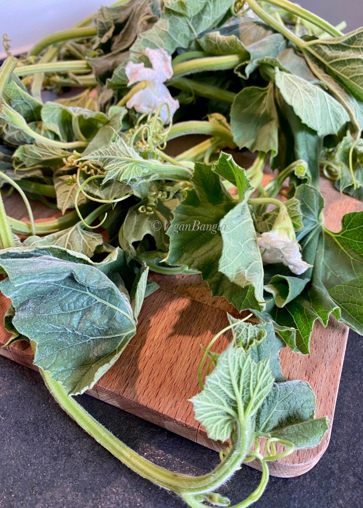The leaves are soft and velvety, unlike the pumpkin and squash leave. The stems or stalks are bit thick and chewy, so we have to prepare them differently.