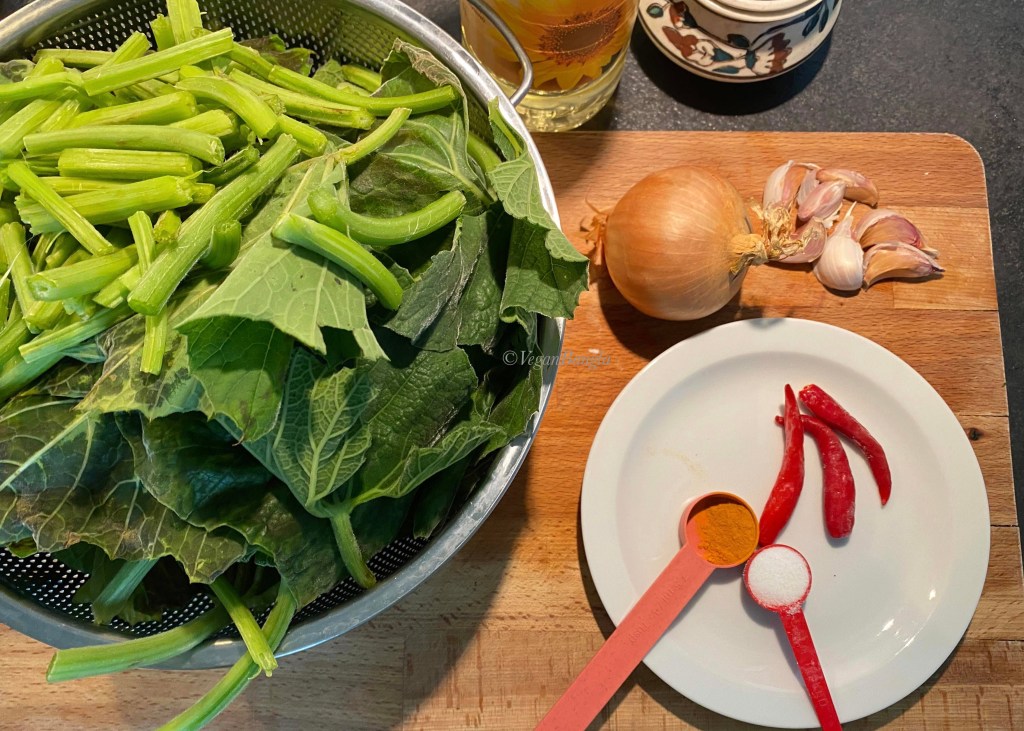 | Ingredients: 400 gram of Bottle Gourd Leaves /Lau Shak 2 cloves of garlic 1 Large Onion Spice and Condiments 20ml Vegetable Oil 1 tsp fine Salt 2-3 Chili – dried or green(optional) |