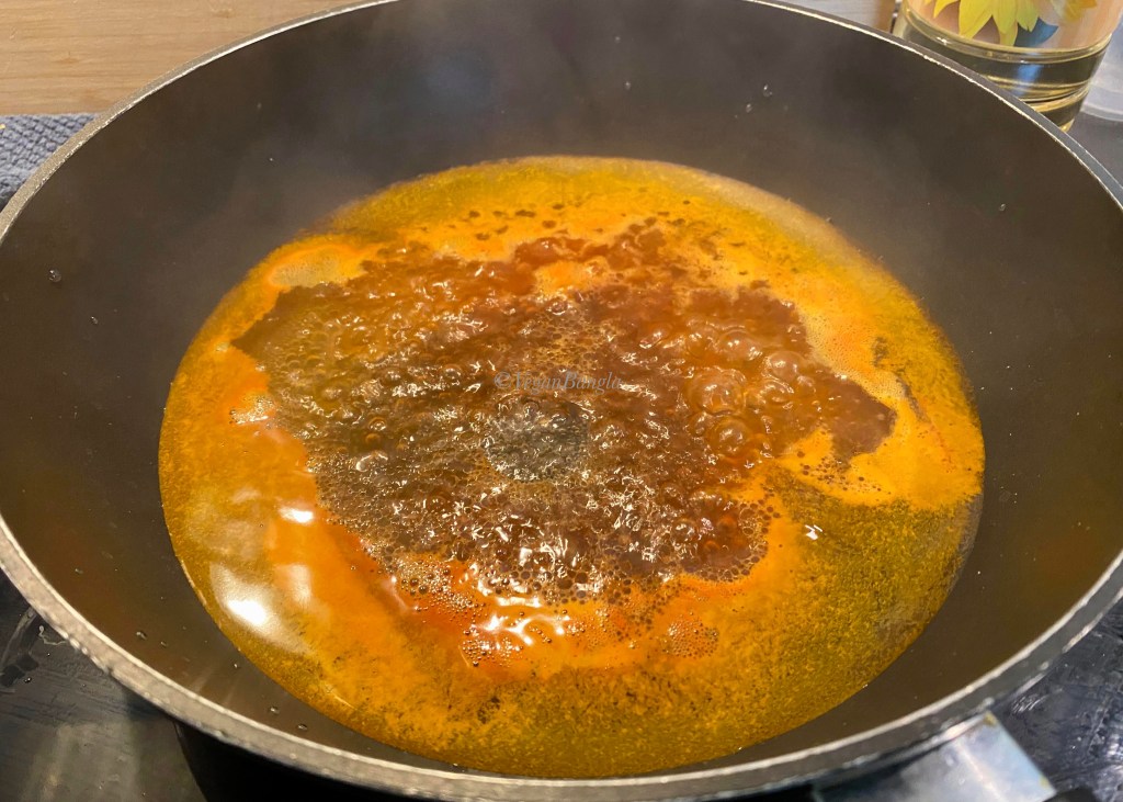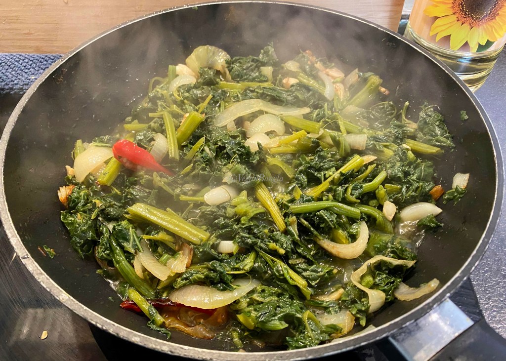The Lau Shak aka bottle gourd leaves will start to get dry and oil starts to get separated from pan. You can fry them extra to make it tastier. But I like it dark green, not brown! So I would take them out of stove at this point. It will be something very new to a non-Bangladeshi, so its good to know that you only chew the stem, do not swallow it. That’s why you can completely leave the stem and cook the leaves only, if you are a new to this recipe! So enjoy LAU SHAK with warm rice!