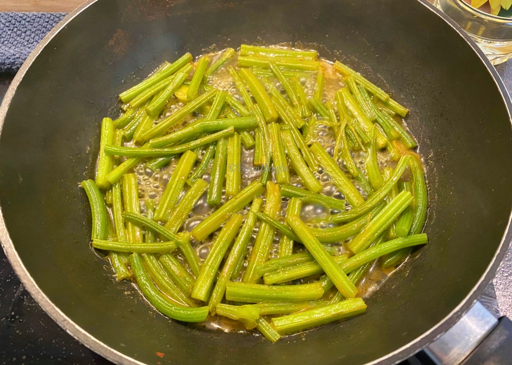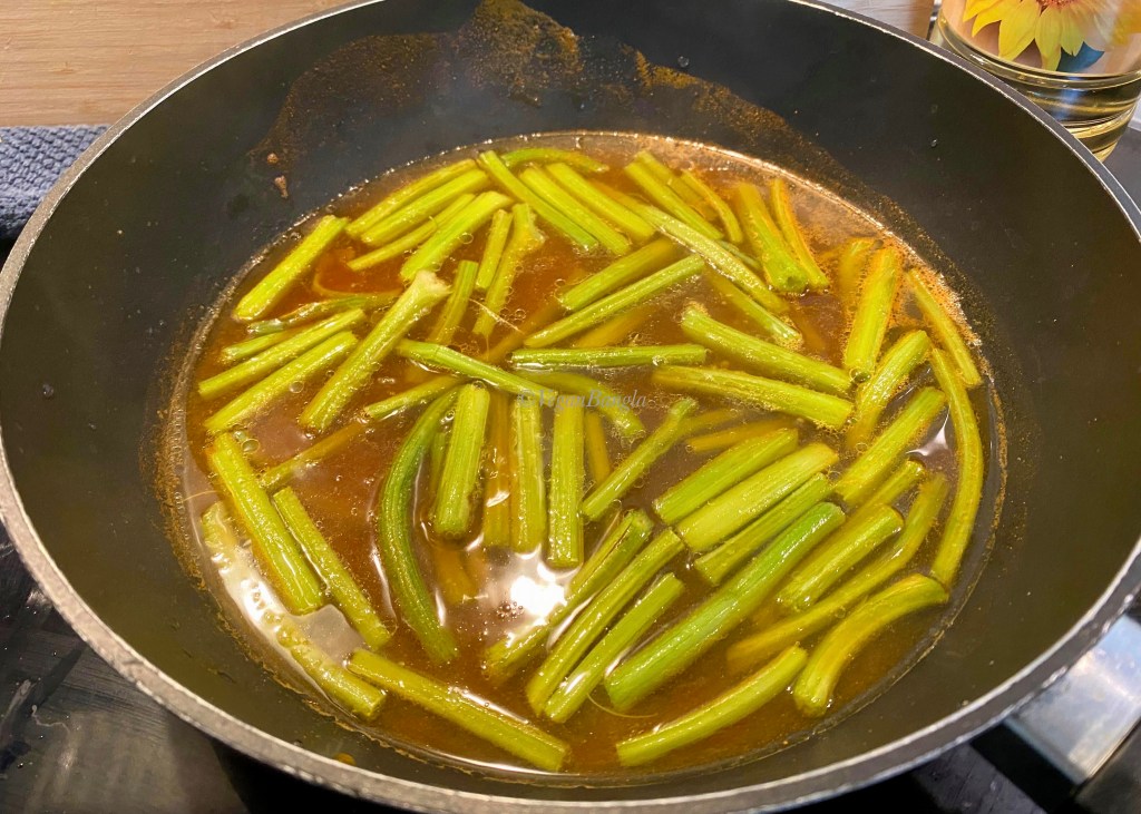 Take a deep pan, boil some water (around 100ml) with salt and pinch of turmeric. When water starts to boil, add cleaned stems. Cook the stems until they are soft and changes color from dark to bright. You can dry out the water completely but be careful with the temperature, as you don’t want them to burn.