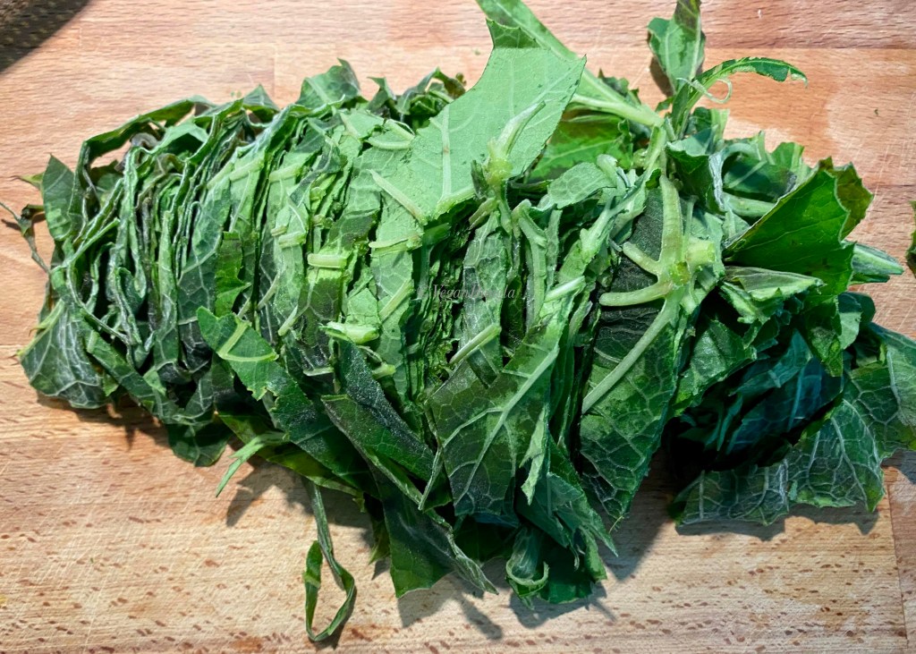 While the stems are getting cooked, lets chop the leaves. Take the leaves in similar size, I started with the big ones, place on top of each other and roll them. Then chop the leaves fine. Repeat the same with small leaves.