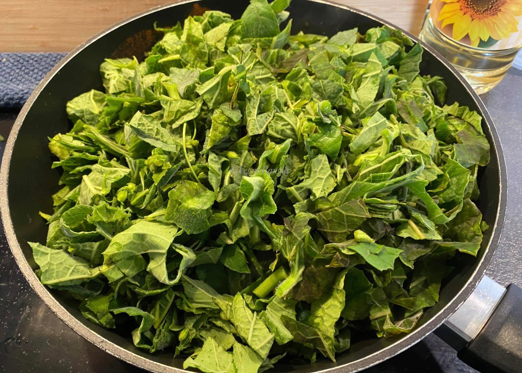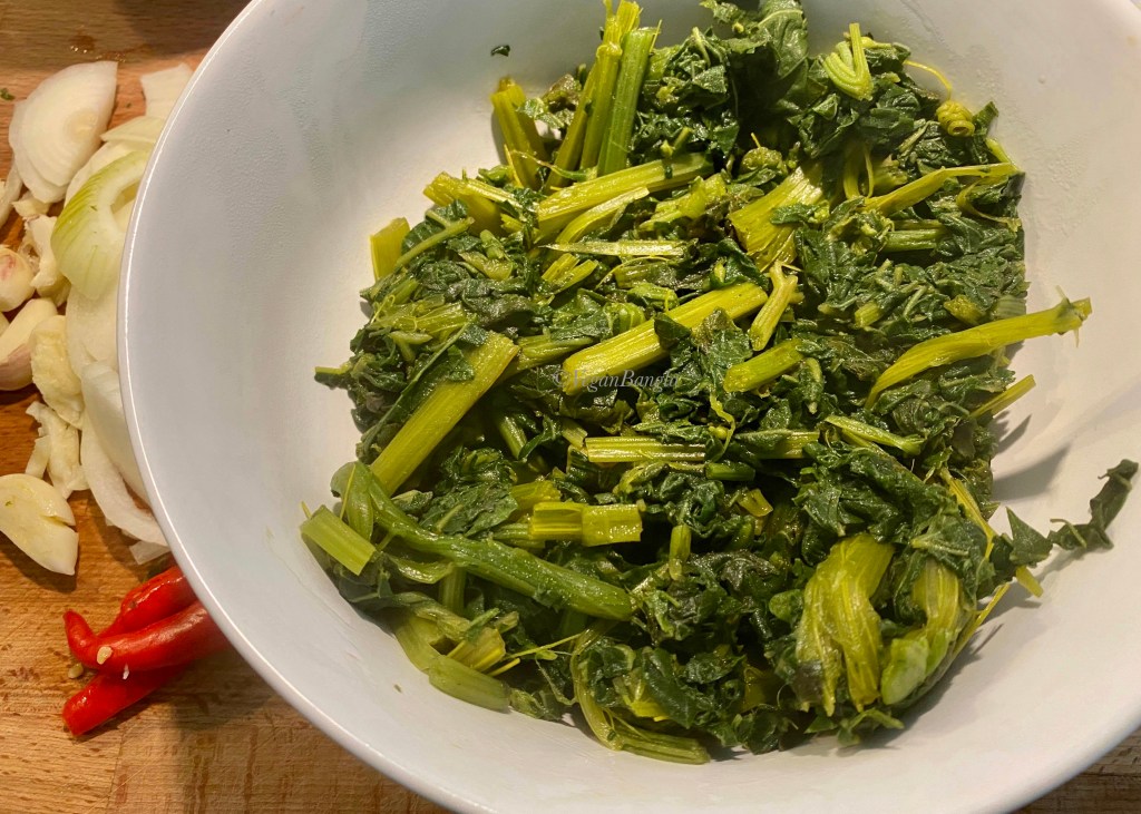 Add the chopped leaves with boiled stems. Now we have to steam everything in low heat. You add little water just to be safe, around 50ml. The leaves will release and get cooked eventually in its own water. Don’t be afraid with the volume of the leaves, they gonna get shrunk anyway!