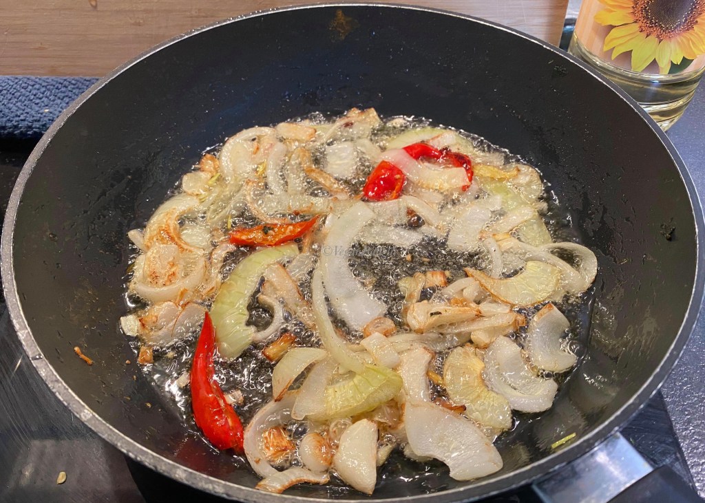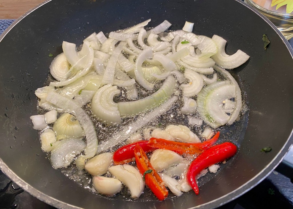 In the same pan, add vegetable oil and heat under medium temperature. Add sliced onion, crushed garlic and chili. Fry everything until golden.