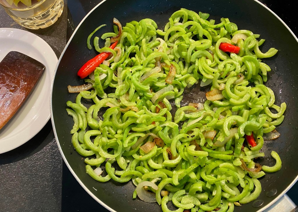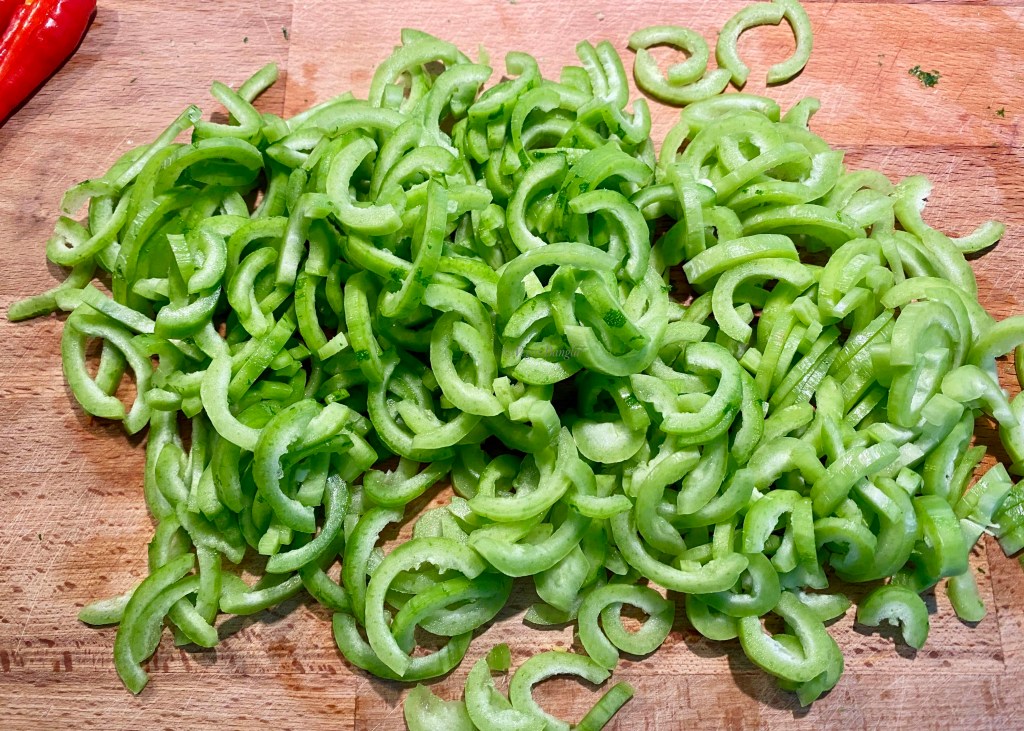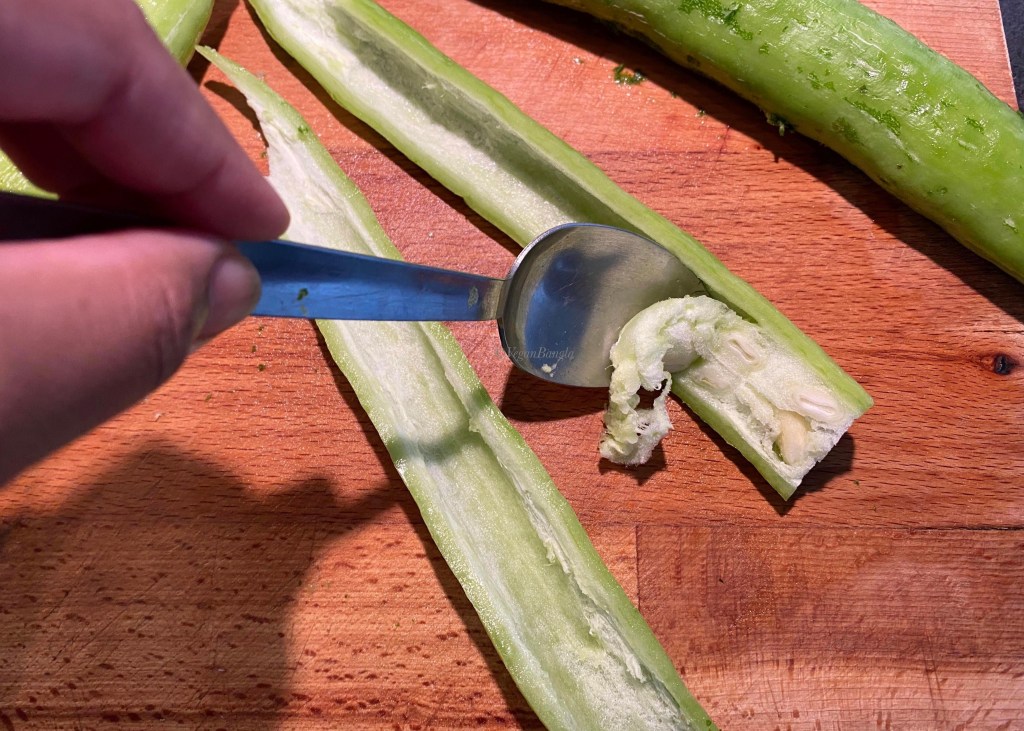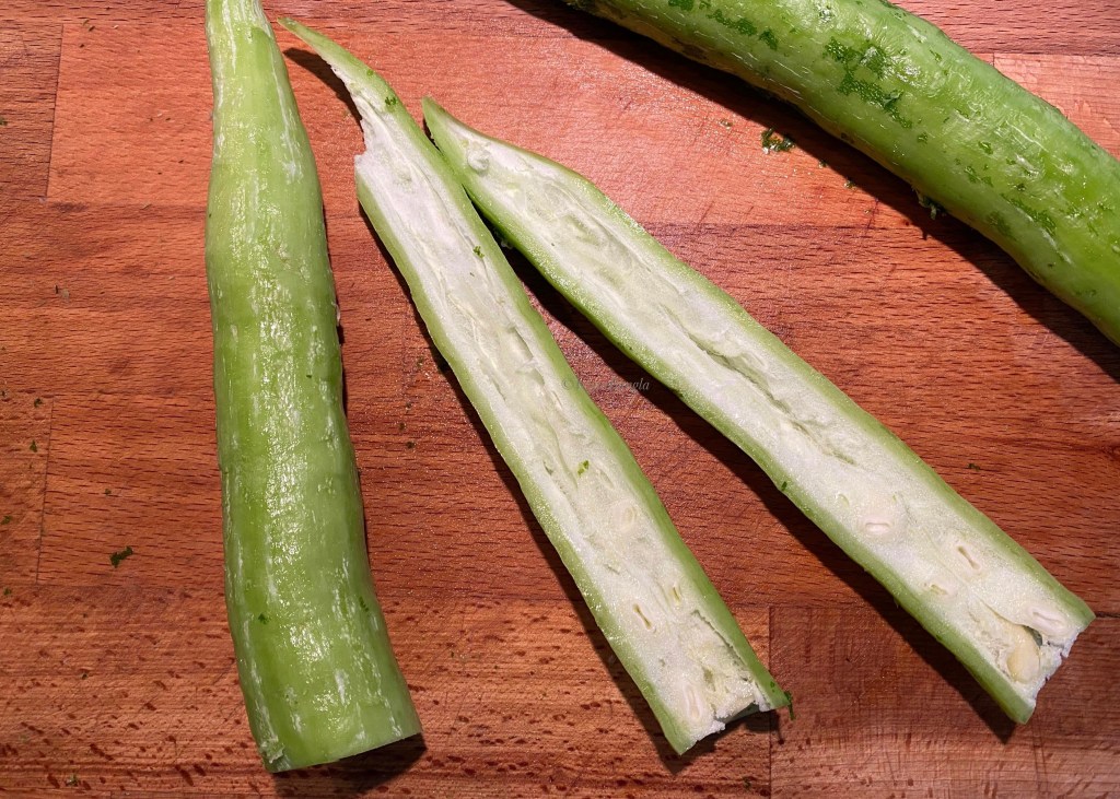Chichinga has a very thin waxy layer outside, so we have to shear the outer skin very lightly with the tip of the knife. As you can see in the picture, the outer skin gives the typical stripped look on this peculiar vegetable. The more you shear, the more you see the inner bright green middle layer. However, some people prefer to keep the layer. I myself eaten chichinga with outer skin on lots of time. So you can skip this step totally.