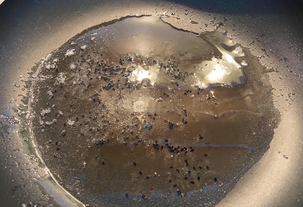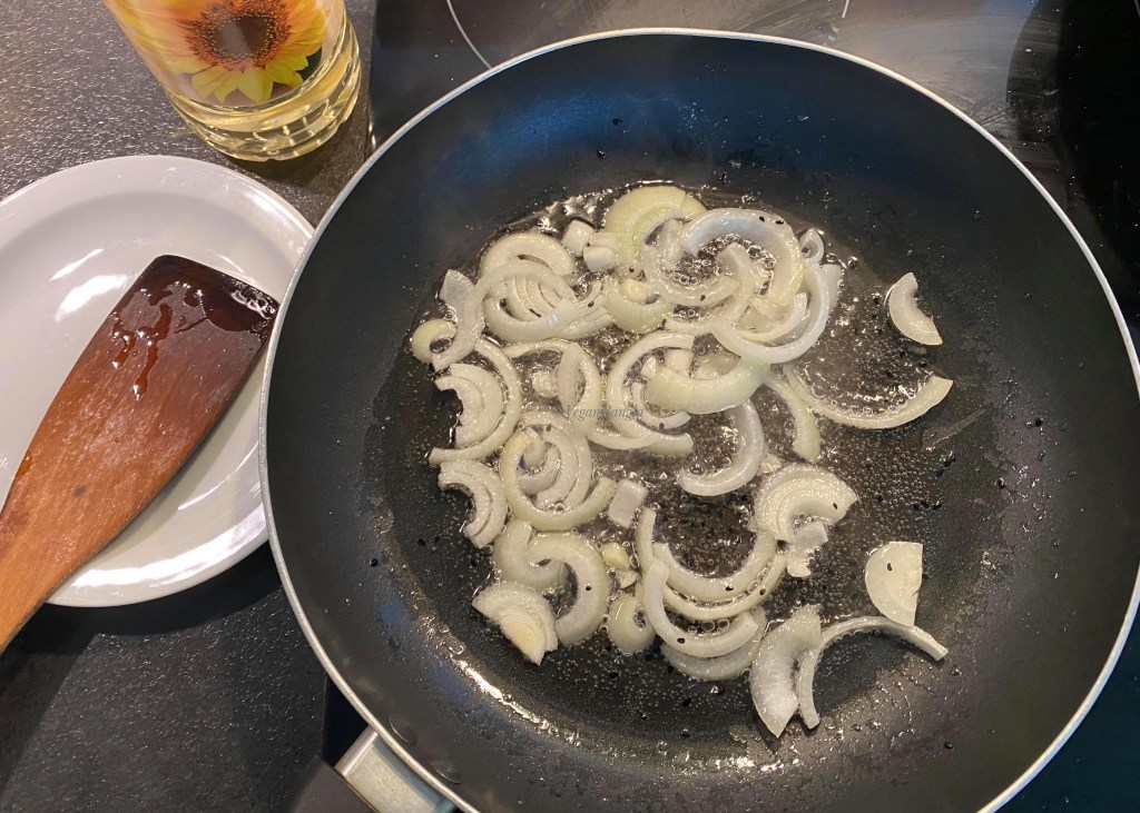 Now its time to cook. In a pan, warm 2 teaspoon of vegetable oil under medium heat. When the oil is warm, add black cumin (nigella) seeds. Add sliced onion when black cumin starts to bubble. Fry onion until golden brown.