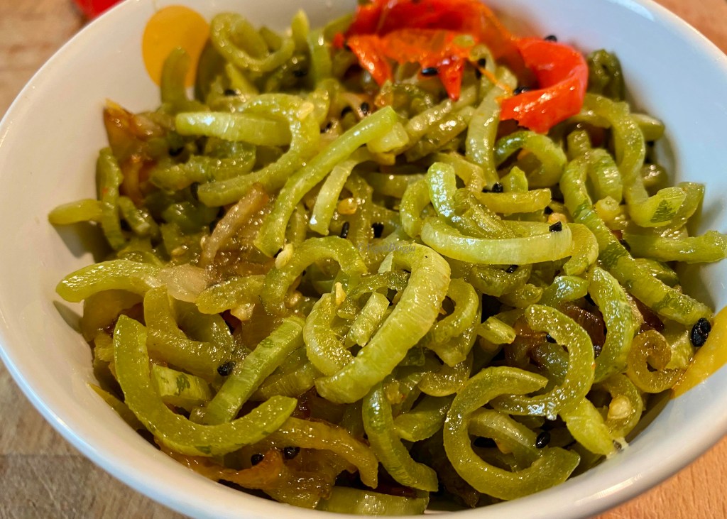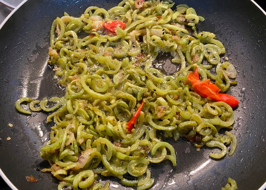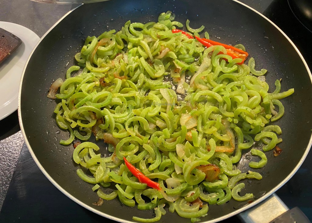 | Ingredients: 2 Snake Gourd or Chichinga 1 Medium onion 2 Green Chili 1 teaspoon Black cumin 20ml Vegetable oil 1teaspoon Salt |