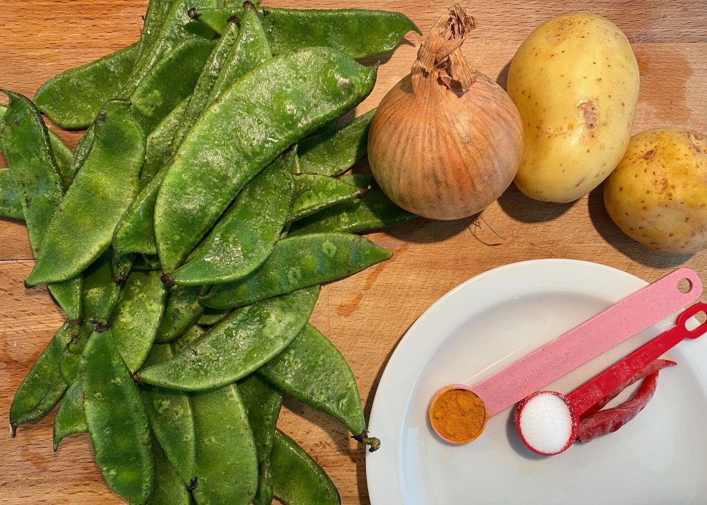 | Ingredients: 250g Hyacinth Bean/Sheem (can be replaced with flat beans) 2 big potatoes Spice and Condiments: 40ml Vegetable Oil (Olive/Mustard/Coconut oil, anything will do) 1 medium Onion 1tbs fine Salt 1tsp Turmeric powder 2-3 Chili (optional) |