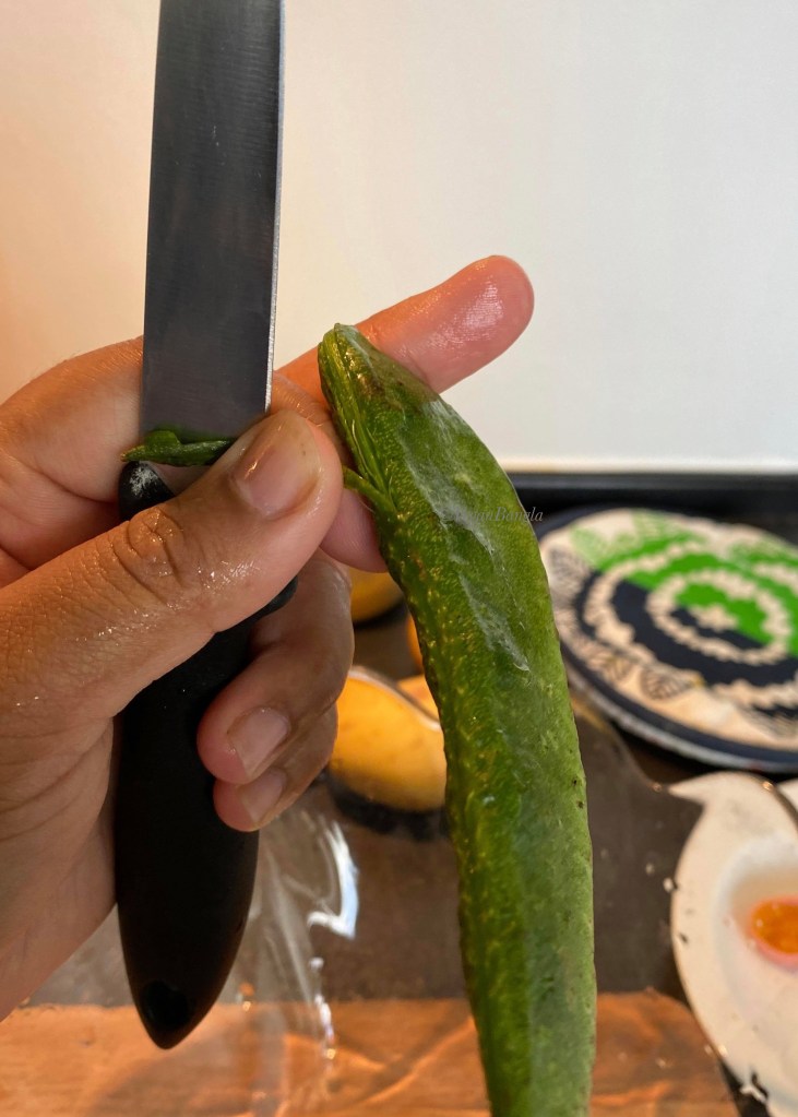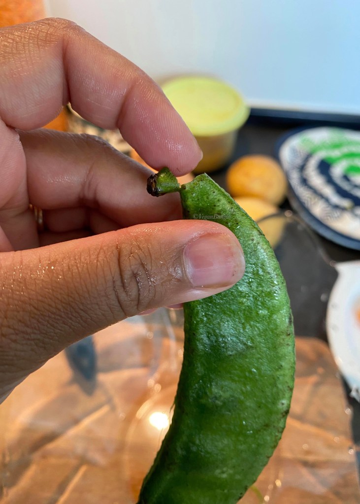 There are hard veins on both sides of the bean. So what we do usually is lightly make a cut on either end and pull off. You can see in the picture how the hard vein is coming off. If the bean is too green or young, then you won’t be able to pull of the vein. And that’s ok.