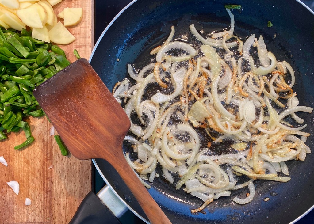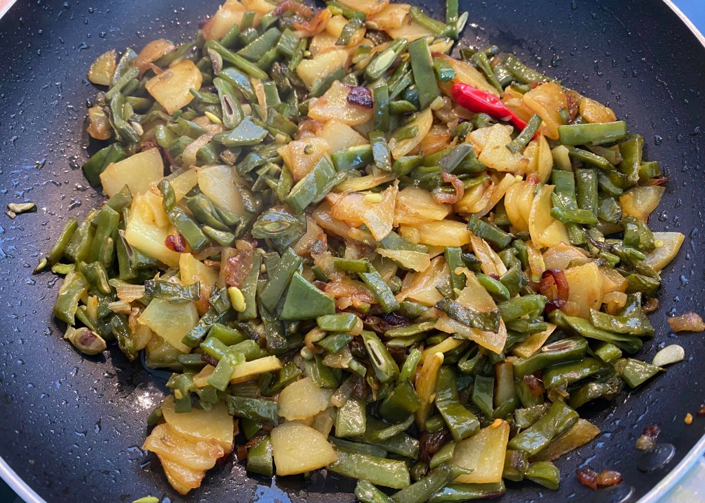 You can see in the picture that edges of potatoes are slightly red and roasted. At this stage, add sliced beans(Sheem).