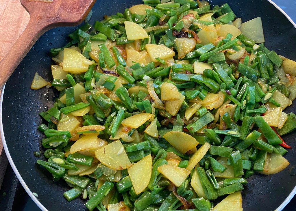 Stir fry sliced beans with potatoes for about 5 minutes. Remember to keep the flame in medium heat.