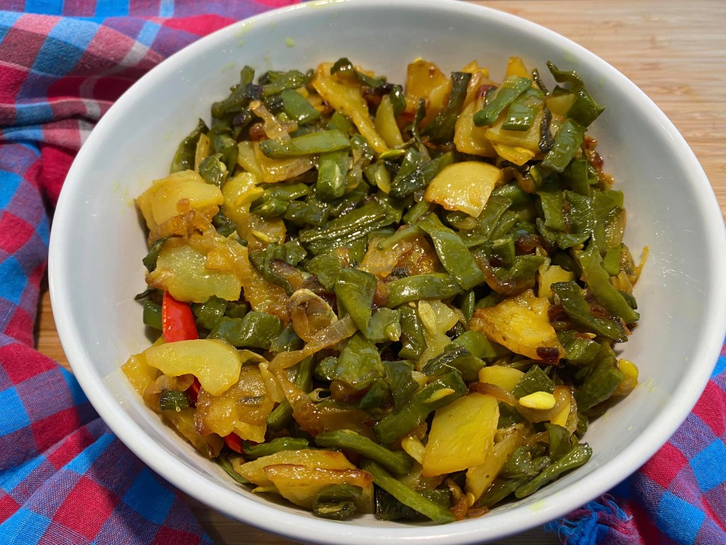 The Sheem Bhaji ask Hyacinth Potato stir fry is ready to serve. Eat with rice or tortilla or hand made flat bread (ruti).