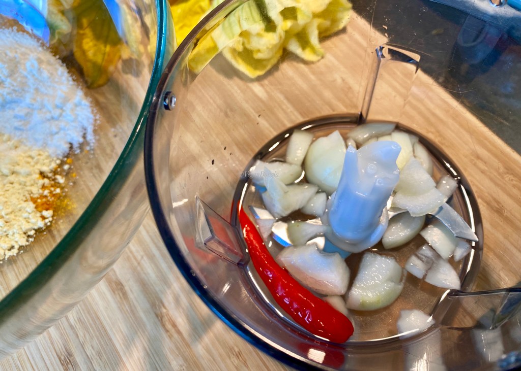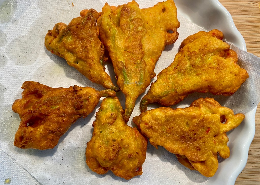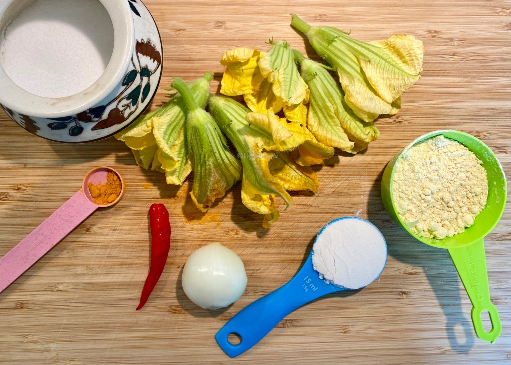 | Ingredients: 7-8 pc Squash/Pumpkin/Zucchini flowers 200g Gram flour (aka Chickpea flour or Beshon) – Alternatively use plain wheat flour 50g Rice flour Spice and Condiments 100ml Vegetable Oil (any neutral taste oil will do) 1/3tsp salt 1/2tsp Turmeric powder 2-3 Green chili 1 small Onion |