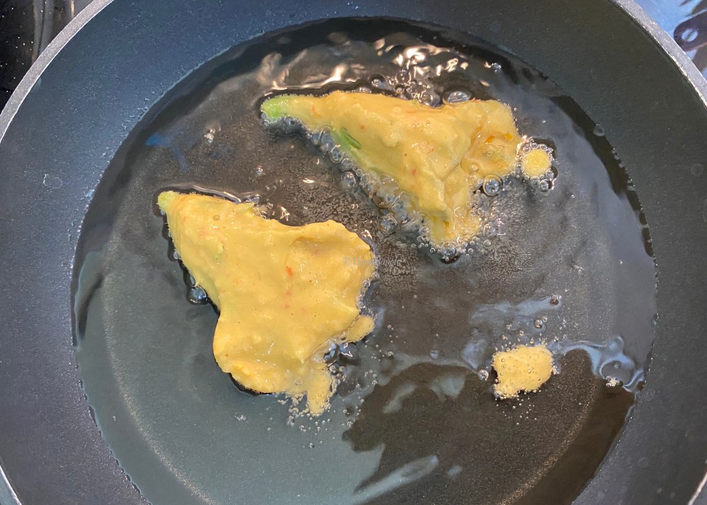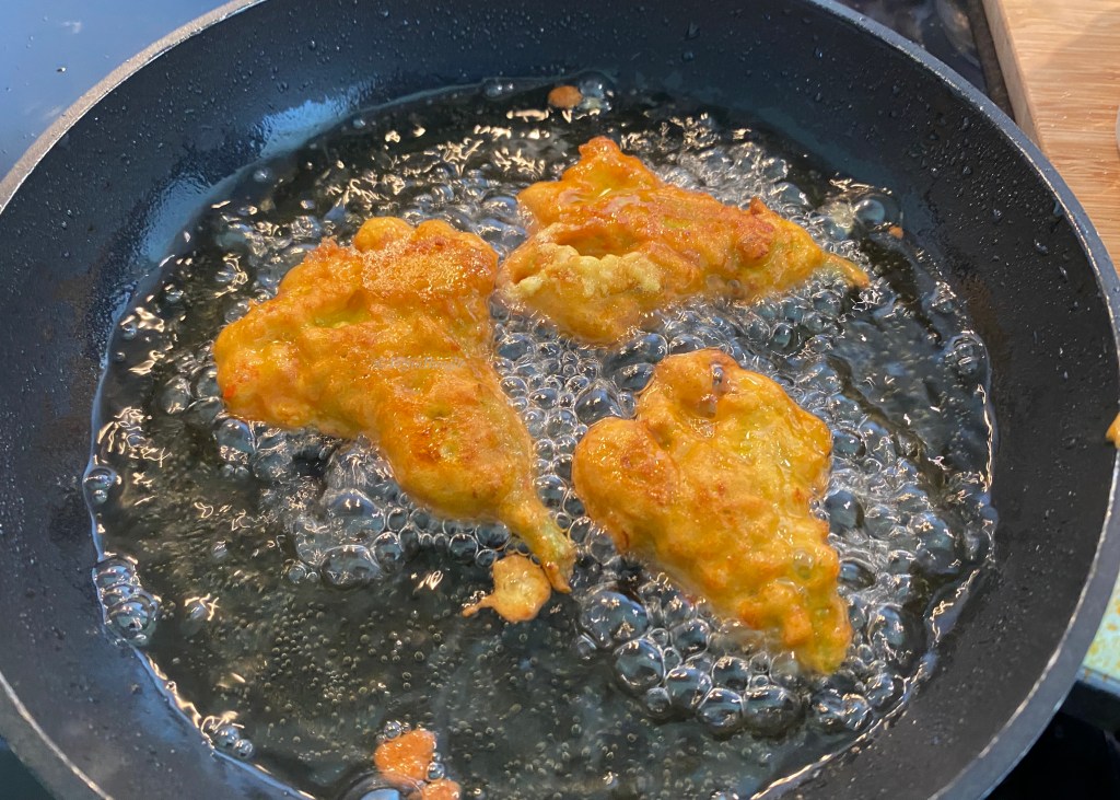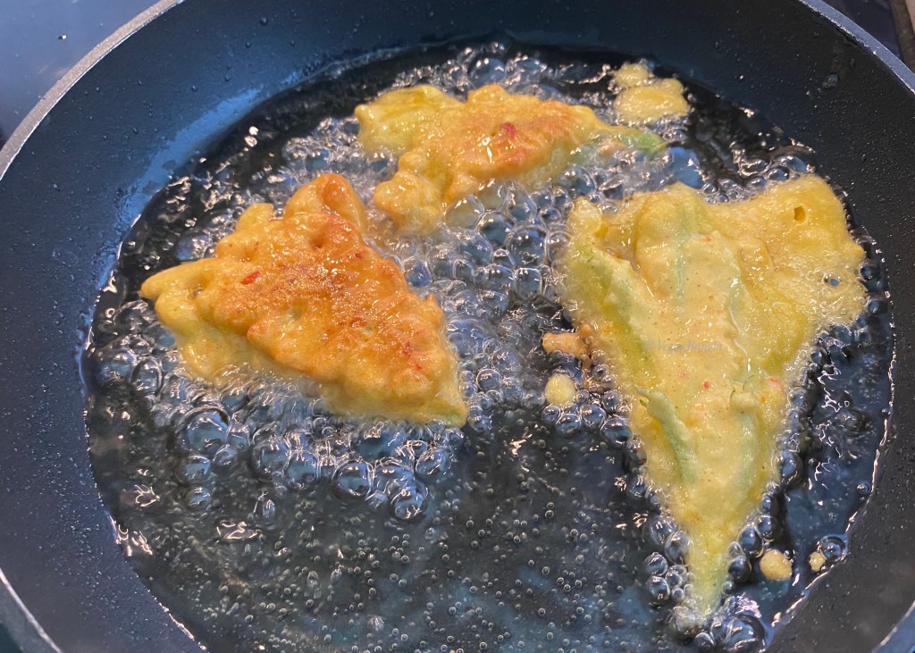 Heat the oil in a deep skillet over medium heat. When a drop of batter sizzles in the pan, the oil is ready. Gently lay the blossom in the pan and repeat with 4 or 5 more flowers, depending on the size, don’t over-crowd the pan.