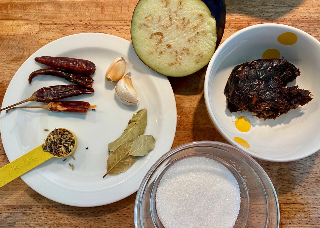 | Ingredients: Half of Aubergine Pulp of 100g Tamarind 2 cloves of garlic 2 bayleaves 1tea spoon of Pach Phoron (Mix of nigella, cumin, fenugreek, mustard and aniseed) 2-3 dried chili 150 g sugar (or to taste) |