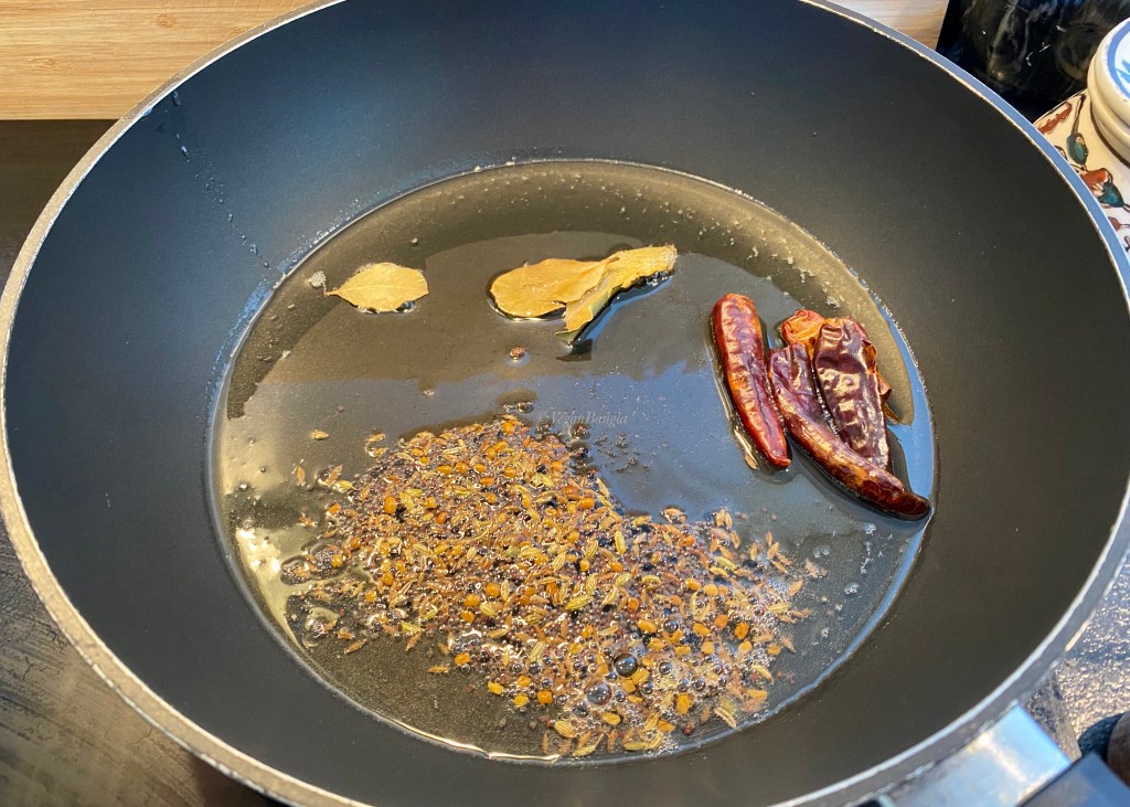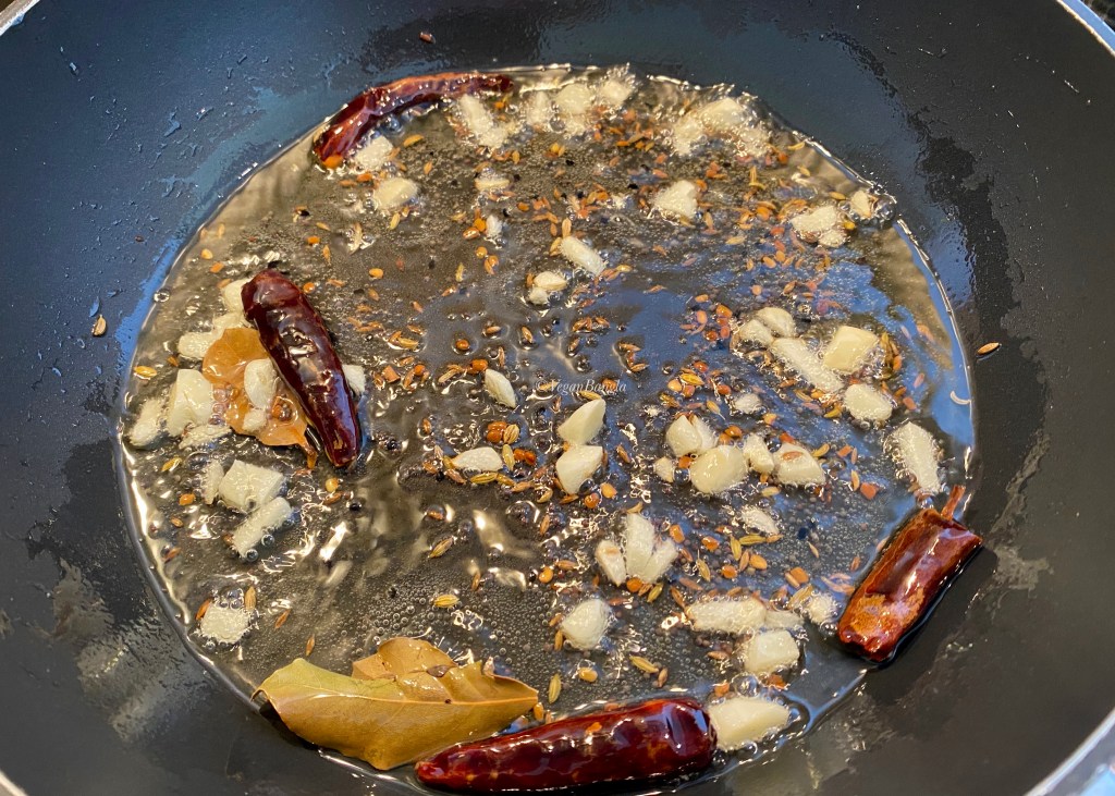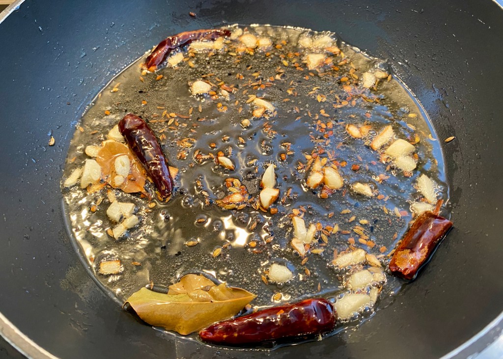 In the same pan, heat up more oil and then add Pach Phoron, bay leaves and dried chili. When they starts to release fragrance, add chopped garlic.