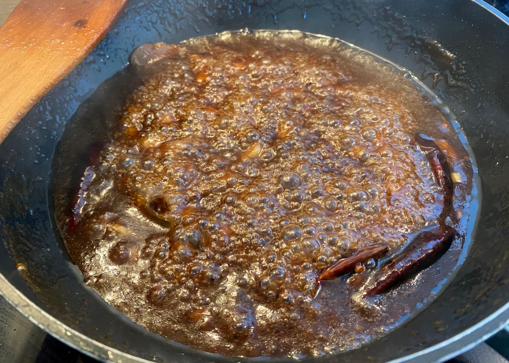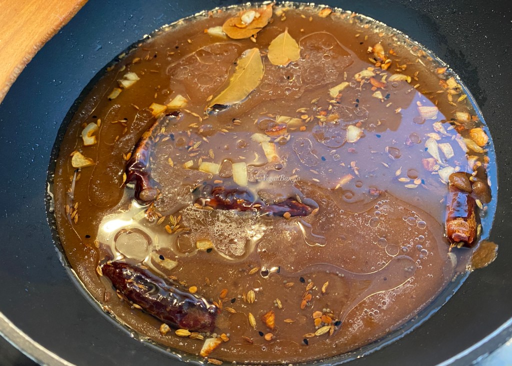 The recipe has a special ingredient, that is Tamarind, which gives the tangy taste to the recipe. Besides you also need sugar, Pach Phoron, dried chili, garlic and some salts.