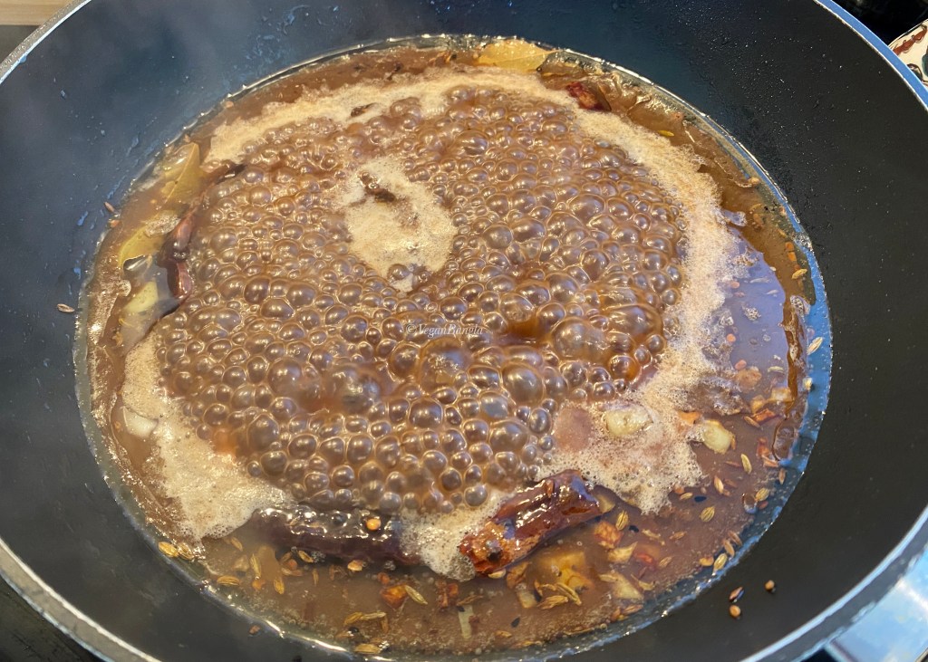 So when garlic is golden brown, add tamarind pulp. Add salt to taste and let it simmer for few minutes.