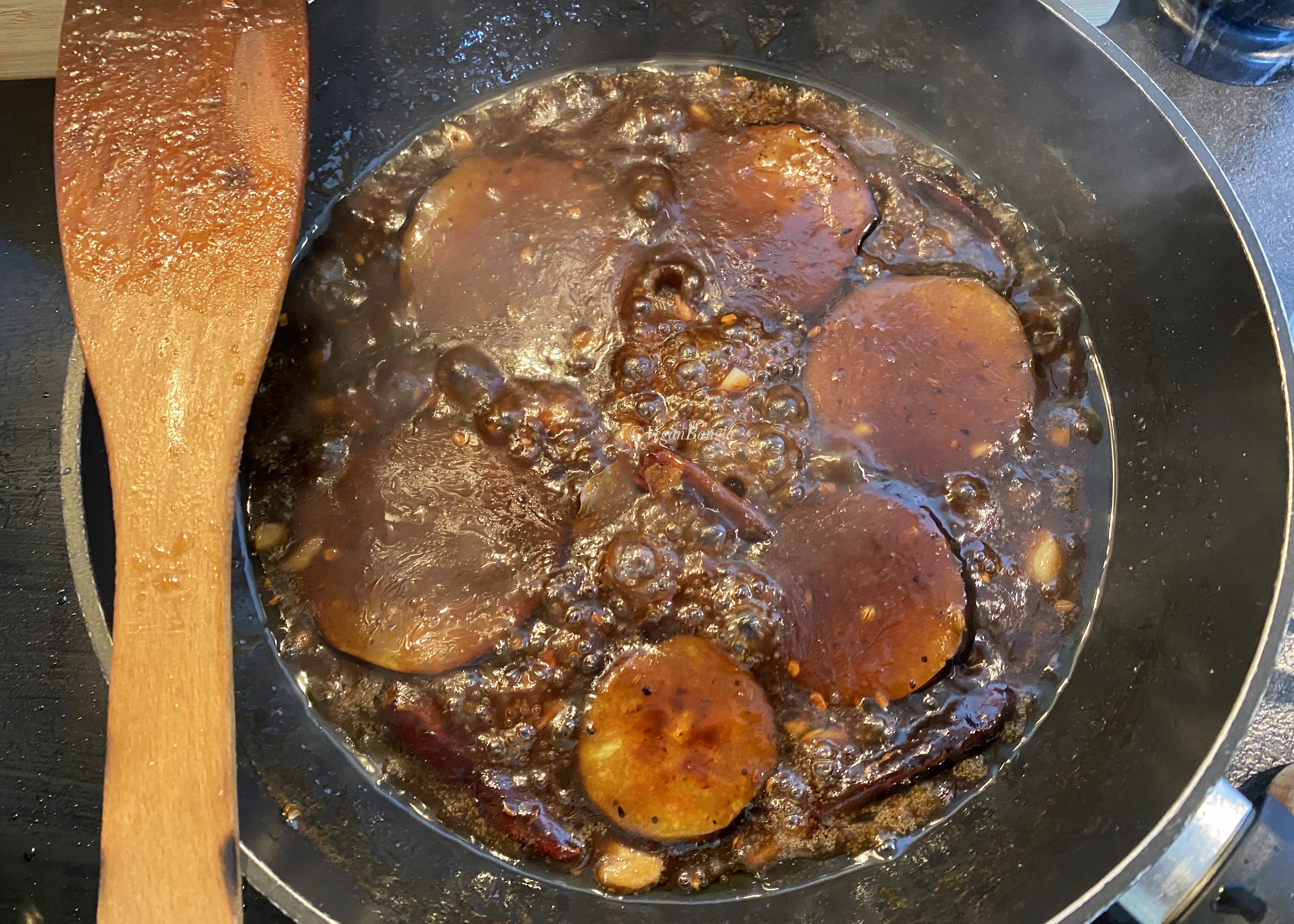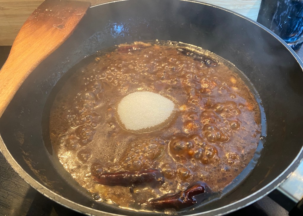 After simmering the sauce a little, add sugar and carefully mix. Keep your stove temperature low, as the sauce tends to splatter. Check salt and sweetness of the sauce and adjust according to your taste. Cover the pot and let the sauce simmer for few more minutes until it decreases in volume.