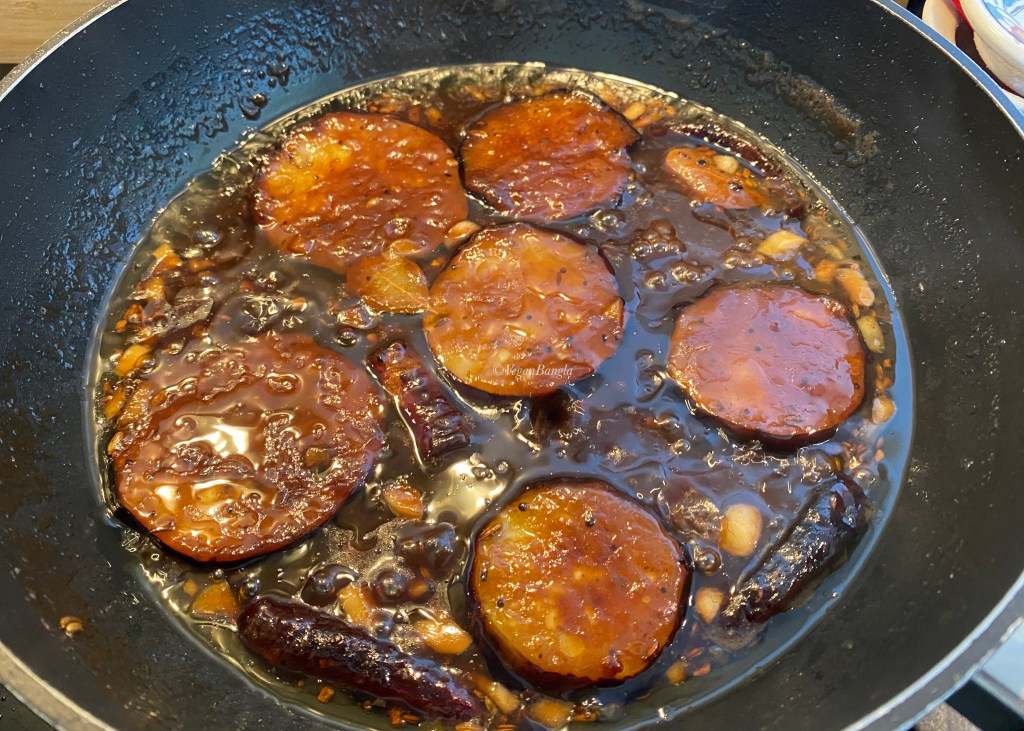 I have been meaning to write this recipe for very long time but I rarely have the occasion to make this recipe – Sweet and Sour Aubergine or Begun er Tok (বেগুন এর টক). This is one of the best pair to go with Daal, Polao or any vegetarian dish you make and it brings the tangy and sweet flavor to your pallet.