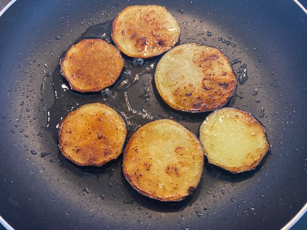 Slice then aubergine in your preferable shape and shallow fry them. I have not used any seasoning here, but if you want, use little bit turmeric water and salt. When aubergine has nice and golden color on both side, keep them aside.