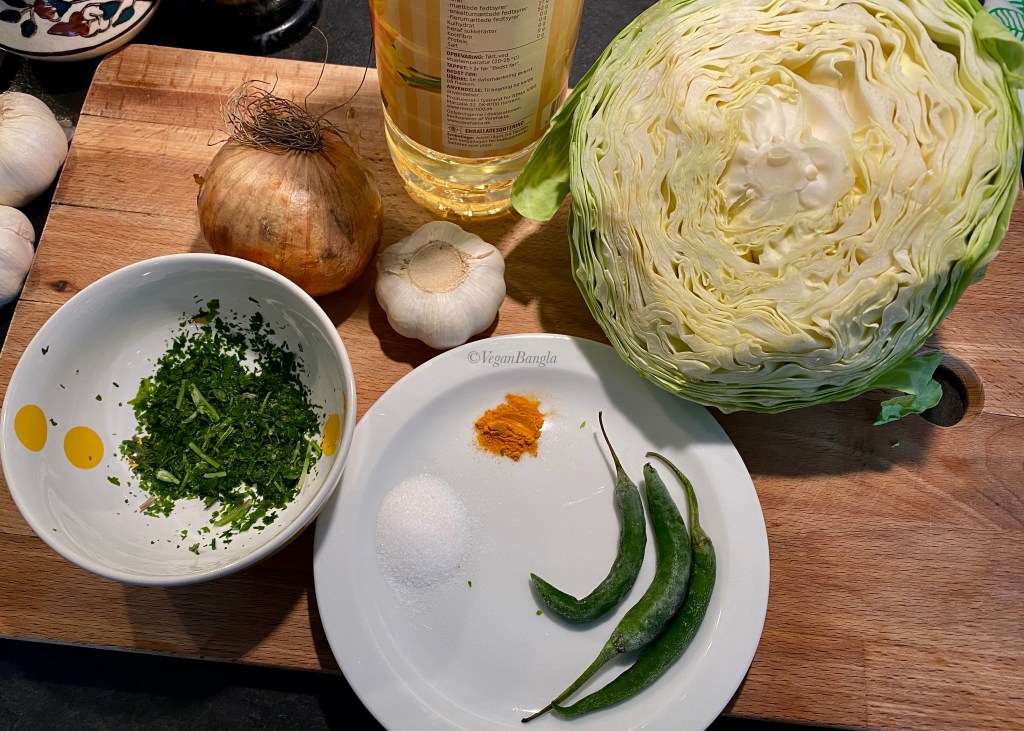 | 1. Wash and chop up the cabbage very fine. In a pot, add chopped cabbage, salt and turmeric powder and 50ml water. Mix everything well and cover the pot. Simmer under medium low heat. 2. After 8-10 minutes, uncover the pot. Check the bottom of the pan if they are getting stuck. Let dry all excess water. When cabbage is soft and all excess water is reduced, turn of heat and keep the steamed cabbage separately in a bowl. 3. In the same pot, add vegetable oil. When oil is hot, add chopped garlic. Cook until reddish and then add chopped onion. Cook until onion are golden brown. 4. Add steam cabbage to onion and garlic. Slice up green chili and add with cabbage. Mix everything well. 5. Check for salt and add more if you need. Chop some coriander leaves and add to cabbage. Serve with rice,ruti or porota. |