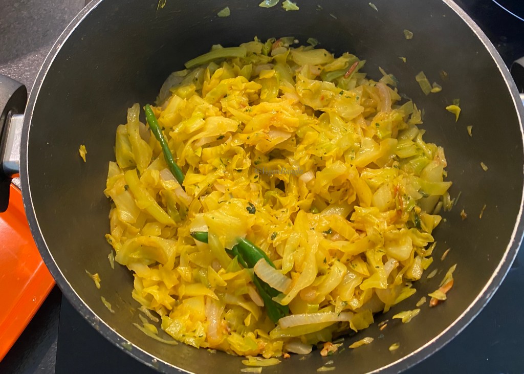 My steamed Cabbage is almost ready. I have just added chopped fresh coriander leaves and mixed them well. Again, if you don’t like fresh coriander, just skip this step.