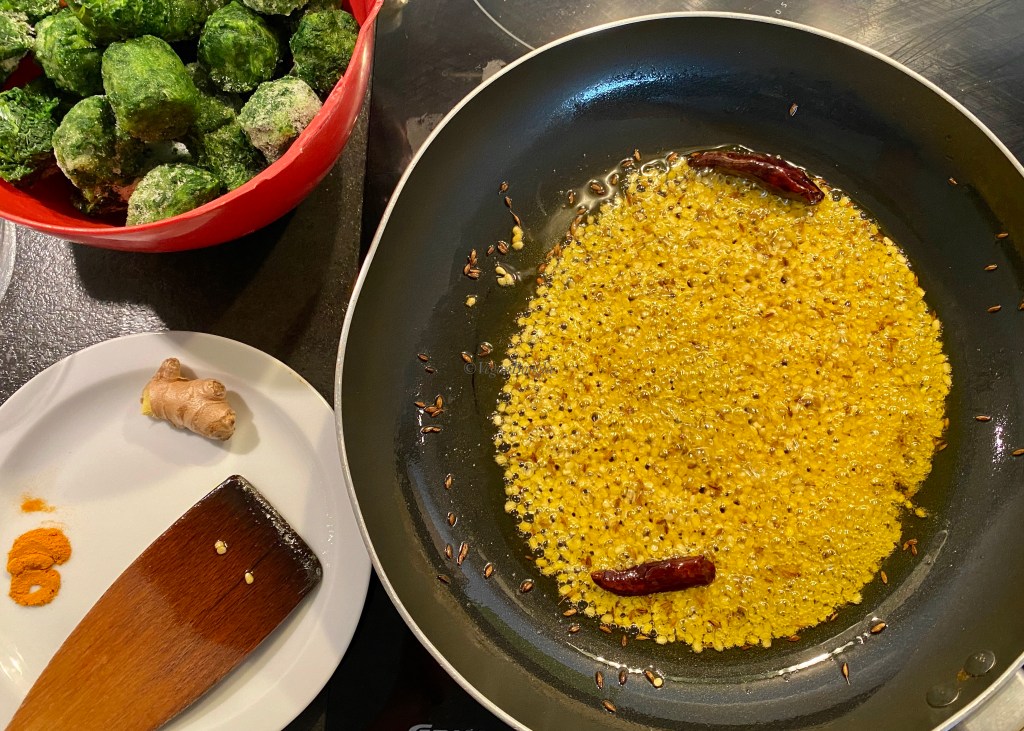 The one special ingredient we need today is the yellow lentil aka Muug Daal (Vigna radiata). I hope that you have this in your kitchen! Besides, we need spinach (I have used frozen), ginger, some chili, cumin seeds and turmeric powder! Oh, I have used my special Bangladeshi Mustard oil today, but again you can use any vegetable oil of your choice!