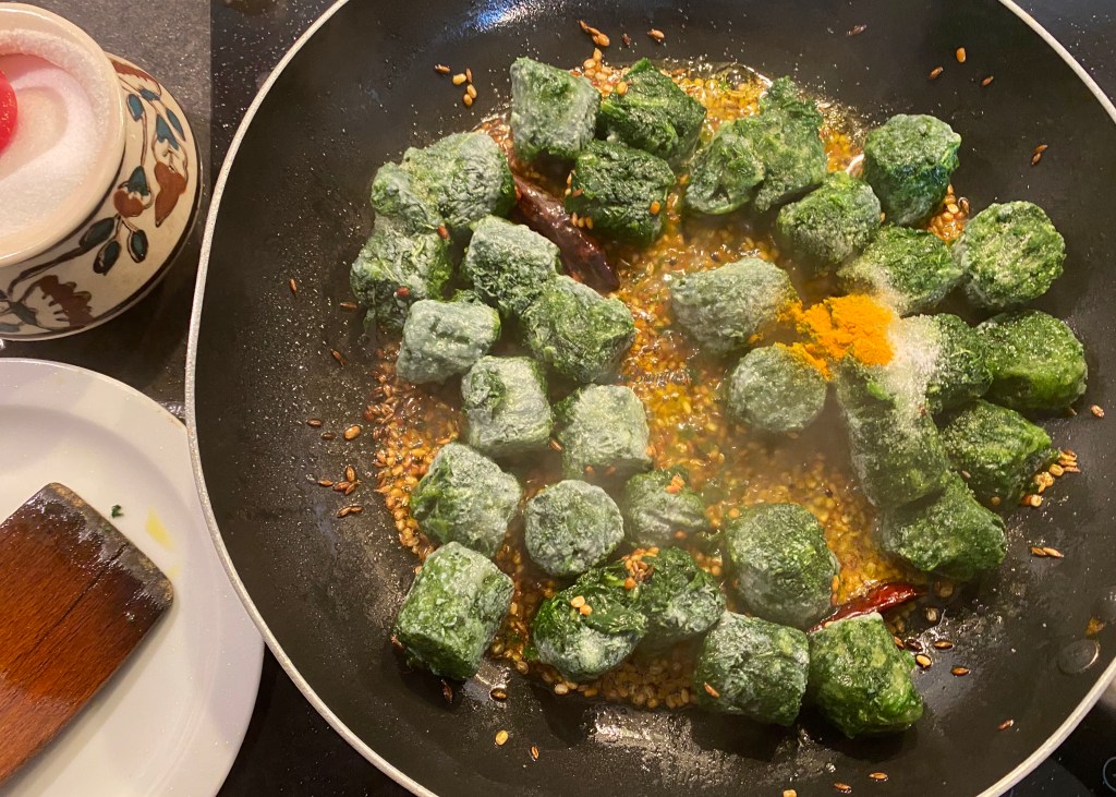 | Instruction: 1. Take a pan and add vegetable oil. Heat under medium temperature. Then add cumin seeds and dried chili and sizzle them for few seconds. 2. Add previously soaked and drained muug daal to the pan. Roast untl they slightly change the color. Keep the pan under low heat. 3. Add frozen spinach directly. If you are using fresh spinach, clean and chop them first and then add to pan. Also add salt and turmeric powder. 4. Cook spinach for 5 to 6 minutes until they melt or reduced in volume and excess water are gone. Now add finely chopped ginger and stir mix well. 5. Cook spinach with ginger for 3-4 minutes,depending on how much you want to cook your spinach. 6. When spinach is cooked as your preferred way, take out of the pan and serve warm with rice! |