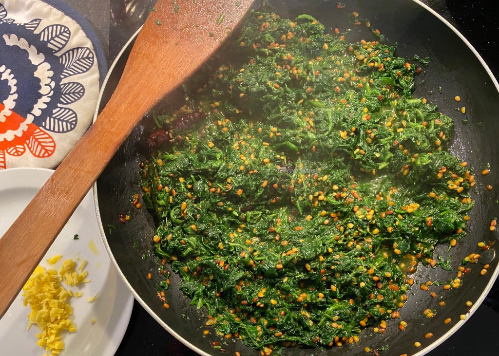 I have covered the pot one more time after adding ginger to let the flavor soaked into the spinach. After two to three minutes of simmering in low heat, I stir cook the spinach for last few second until all extra water are gone and spinach looks nice and cooked!