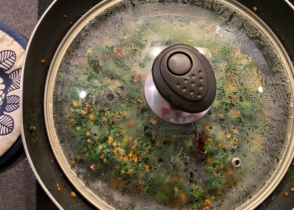 After the frozen spinach is melted, I uncover the pot and cooked the spinach for a 5 to 6 minutes. It depends on you how much you want to cook the spinach.