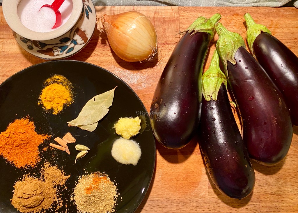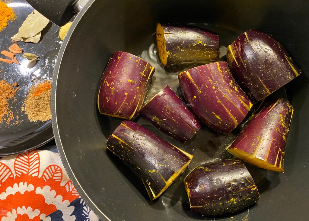 | Instruction 1. Wash aubergines and cut 2 inches long. Then make few slices on the both sides. Soak the aubergine in cold water for 10 minutes. 2. Drain water and pat dry the aubergines. Then coat with turmeric powder and salt. 3. Heat 2 table spoon of oil in a wok or skillet. Shallow fry aubergine until they are golden. Set them aside. 4. Add sliced onion in the same pan and let them cook until they are golden. Then add garlic and ginger paste. Cook for few seconds and add turmeric, chili, cumin and coriander powder. Let the spices cook for 5 minutes (or up until the oil starts to separate and float). 5. Add fried aubergine, salt and give them a light stir until they are mixed well with cooked spice. Add 150ml water, cover and let them cook for 10 minutes. 6. Simmer curry til the gravy is in desired consistency. Check salt and add more if needed. |