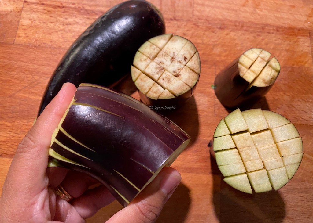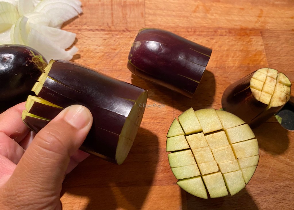 There’s a unique way to cut the aubergine for this recipe! First I cut them in 2inches long and then made a few slices on the both side like the picture. Make sure the slices are not all through from one side to another side.