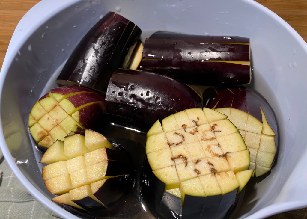 Then I soaked all the aubergine in cold water for 10 minutes. This process help reducing them getting darker. Aubergines are like apples, if you leave them in the open air, they start to get brown.